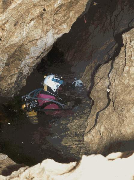 relais. Dans le S4 le fil qui était usé lors de la dernière plongée est cassé, il n'a pas résisté aux crues, donc il a fallut équiper sur 30 à 40 mètres jusqu'à -20. Nous installons une corde dans la vasque du S4 pour pouvoir accrocher les relais que l'on laisse à ce niveau. Ce qui évitera de retrouver le matériel au fond du S4. |