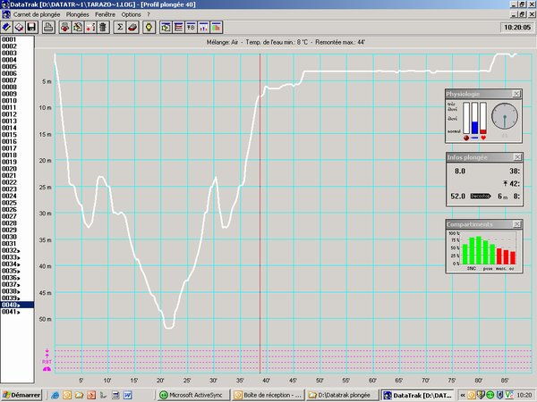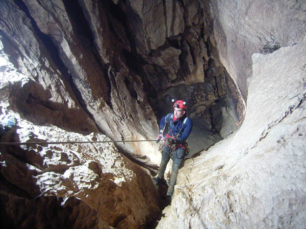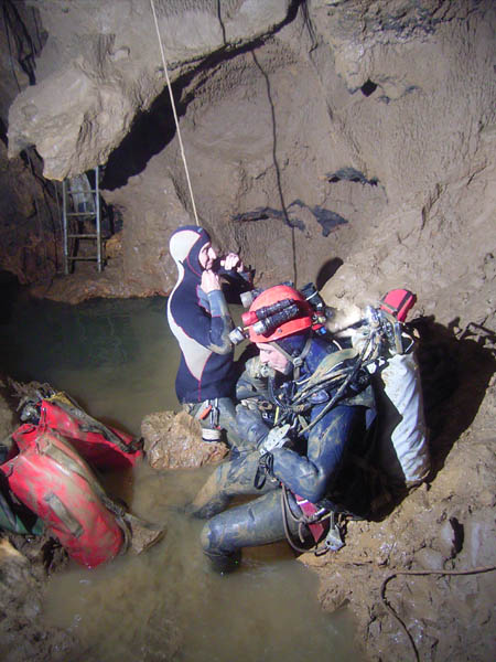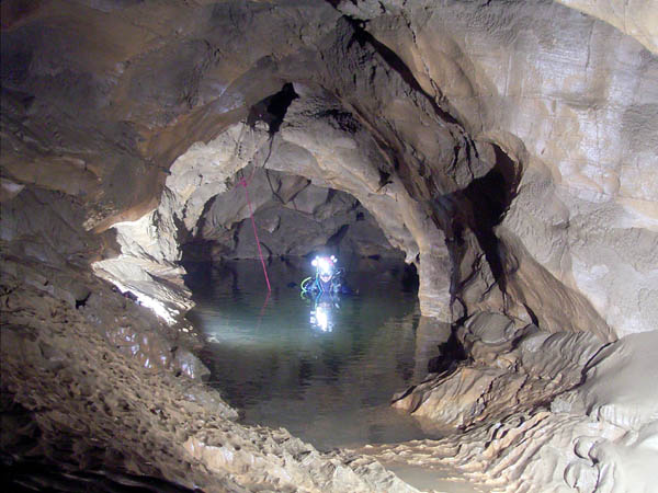 Historique : Cette résurgence majeure du massif du Bugey voit une première série d'explorations à la fin des années 70 par une équipe de plongeurs Suisses. Ces derniers franchissent les trois premiers siphons, réalisent les escalades à la sortie du S3, plongent le S4 (réalisent la jonction entre la sortie du S4 et la galerie supérieure menant au S5) et le S5 (arrêt vers 180m, -32). Le réseau est repris dans les années 90 mais, en 1993, Christian Roy, de retour d'une pointe dans le S5, décède à 150m de l'entrée de ce siphon. Explorations 2006 – 2007 : voilà déjà plusieurs années que le Pertuis me tente. Finalement, au printemps 2006, je reconnais les trois premiers siphons et m'arrête en haut de l'escalade menant au S4. En parallèle, Stéphane Lips et Renaud Locatelli rééquipent l'escalade menant au S5. A l'automne 2006, malgré des conditions de visibilité déplorables, je fais une plongée de reconnaissance dans le S5 afin de vérifier l'état du fil d'Ariane et de prendre contact avec le siphon (bi 10l, 1 relai nitrox 35% de 7l et un relai nitrox 70% de 4l en déco). Lors de cette plongée, j'atteins le terminus de Christian Roy à 250m, -42. La suite est devant moi dans une galerie large (a priori car ce jour là, je n'ai que 1m de visibilité !) mais je sais que si ça continue à plonger il faudra envisager plus de matériel. Le 23/12/2006, aidé de Michel Guis et Jean-Michel Vallon, je dépose 3 bouteilles dans la galerie menant au S5 (2 relais nitrox 35% de 7l et un relai nitrox 80% de 6L pour la déco). Le 7 avril 2007, après 4 mois d'attente liés à des conditions météo défavorables, nous voici réunis pour la pointe. Sont présents Michel Guis, Stéphane Lips (qui en profitera pour plonger le S4), Jérôme Perrin, Vincent Lignier. Jean-Michel Vallon, malade, viendra également nous aider à sortir le matériel. Vers 10H00, nous partons dans le S1. Derrière le S3, nous hissons mes deux bouteilles de 10l dans le P10, puis prenons le chemin du S5 et prenant au passage les relais déposés en décembre. Vers 12H30, je m'engage dans le S5 équipé de 5 bouteilles (mon bi 10l, deux relais de 7l en nitrox 35% pour la progression et un relai de 6L en nitrox 80% pour la déco). La visibilité est correcte et la progression agréable. Je passe le point bas à -32m, remonte et dépose mon premier relai vers 150m. Vers 200m, je dépose le deuxième relai, attache mon fil d'Ariane (cela m'évitera de le faire au terminus à -42 et me permettra de gagner quelques minutes de paliers) et poursuis avec mon bi 10l. La galerie est effectivement large (env 3m de large sur 2m de haut). Elle est rectiligne et descend en pente douce. Je passe le terminus et continue l'exploration : la galerie est toujours rectiligne mais descend toujours. Je reste au plafond et déroule 70m de fil depuis le terminus. Arrivé à -52m (profondeur limite que j'avais fixée), j'attache mon fil et fais demi-tour. La galerie continue toujours avec la même section, mais à cette profondeur les paliers de décompression défilent vite…il faudra revenir avec du trimix. Le retour se passera bien et je commencerai mes paliers à -6m (42 minutes au total dont 8 à 6 mètres). Ayant opté pour une combinaison « humide », je passerai mon temps à palmer pour retarder l'arrivée du froid (eau à 10°C) et apprécierai le sentiment de sécurité apporté par mon nitrox 80% ! Sortie du S5 après 85 min de plongée. Au retour, Vincent et Michel en profite pour prendre de nombreuses photos. Nous ressortons tout le matériel et regagnons l'air libre vers 17H30. La prochaine plongée se fera au trimix (Hélium, oxygène, azote) et nécessitera une logistique bien plus lourde mais permettra de pousser l'exploration plus loin avec des conditions de sécurité optimales.
