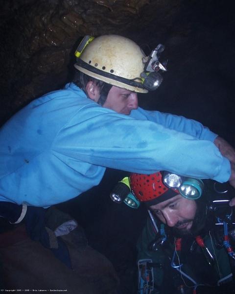 15h15, accompagné de toute l'équipe je suis devant le siphon. Le stress commence à retomber, je sais que c'est le moment ou je vais pouvoir réaliser ce rêve et apprécier la plongée vers l'inconnue. Je suis tel un hippopotame qui a du mal à ce mouvoir hors de l'eau, avec mon Bi-10 gonflé à 245 bars et mes deux relais 6 litres à 235 bars (j'ai un peu perdu par apport a la veille ou je gonflais à 265 bars les blocs, mais je le savais, à froid la pression est moindre). Avec mon petit "A+" traditionnel quand je plonge, je m'élance et l'hippopotame apprécie la mise à l'eau… Je progresse lentement pour découvrir ce siphon. Après 2 ou 3 minutes j'émerge dans la première cloche, une diaclase perpendiculaire au siphon. La suite est assez pénible vu la charge que je trimbale. Un ramping de 15 m, détenteur en bouche