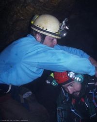 17H30, tout le monde est là. Après quelques boisons chaude, et des explications sur la plongée, nous reconditionnons le matériel pour le retour vers la surface. Nous tractons tous les kits en haut du P 60 sans trop de problèmes. La zone étroite nous donne un peu plus de mal avec l'obligation de déconditionner les fameux kits bleus à certains endroits. Je peu en parler car l'équipe avait eu la gentillesse de m'en laisser un, a sortir... C'est de bonne guerre car le plongeur se doit, au retour de participer activement au portage de son matériel. Il redevient un spéléo comme les autres. Sortie vers 23H et retour à la maison pour tout le monde.