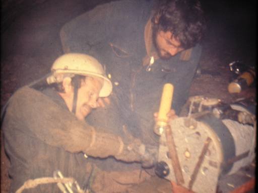 Cette une superbe photo ! Marcel à gauche et Serge à droite. Notre dérouleur est en panne, problème avec les charbons aux graphites. Remarquez notre émetteur de signaux lumineux, ses couvercles étanches, pour le téléphone. Il est posé sur le dérouleur. La torche jaune est une lampe de type Aquaflash. Serge et Marcel réparent le dérouleur, pas facile !!