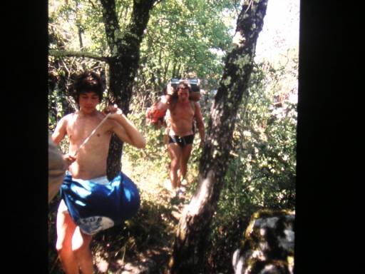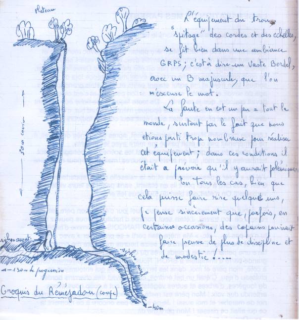 Nous étions en plein travail d'équipement. Le REMEJADOU est un énorme effondrement séculaire. Aujourd'hui, la rivière passe tout au fond et présente deux siphons, un en amont et l'autre en aval. C'est elle qui a rongé la roche et produit cet aven au cours des siècles ! Pour descendre, nous-même et notre matériel, nous avons trouvé un endroit, bien dégagé, aux bords du précipice. Depuis une vire en surplomb (une petite plate-forme rocheuse), on plantait nos « spits » d'ancrages pour nos échelles et nos cordes. On se servait, aussi, des arbres environnant pour assurer nos équipements ! Pas facile de descendre 32 mètres plus bas. Mais on en avait vu d'autres ! Ici nous étions bien, sous un beau soleil et dans ce magnifique bois. Une journée de préparation, pour envoyer nos échelles et nos cordes au fond de cet aven. On faisait la descente sur descendeur, un appareil très simple, mais efficace, pour se laisser glisser le long d'une corde. On se sent comme une araignée sur son fil ! Je me retrouvais près de cette rivière, avec Pépé et Daniel. Tout là-haut, Bob, Marcel, Guy, Henri B. et Henri P., nous envoyaient les sacs de matériel, les équipements de plongées, le dérouleur et toute la signalisation. Tous cela avec nos cordes spéléologiques. En bas, on réceptionnait tout notre matériel et les cordes remontaient pour un nouvel arrivage. Pas mal tout cela, mais, c'est vrai, qu'il fallait bien une journée de préparation ! Le matériel était à poste, ils ne nous restait plus qu'à remonter. Autant la descente était agréable et spectaculaire, autant la remontée était très dure. J'avais fait quelques remontés aux « jumars ». Dans ce cas, nous avons une pédale, fixée par une longe sur notre baudrier. L'autre est fixée au niveau de notre poitrine, sur le baudrier, bien sûr. Ce sont des systèmes autobloquants, qui permettent de remonter sur une corde, mais qui ne peuvent jamais redescendre avec leurs systèmes antichute ! Personnellement, j'ai fais des remontées de 30 à 40 mètres avec ce dispositif. Quand vous arrivez en haut, vous tirez une langue comme un chien qui n'a pas bu depuis trois jours ! On est complètement cassé ! Là, c'était une remontée à l'échelle et c'est aussi crevant ! Tout était prêt, le matériel près de cette rivière, nous ferons nos plongées le lendemain. Cette nuit là, Henri P. et moi dormons aux alentours, sur nos matelas pneumatiques et dans nos duvets. Bien que les risques de se faire voler du matériel, 32 mètres plus bas, ne soit pas élevé, il fallait que l'on s'assure que personne ne viendrait saboter l'installation de nos échelles et de nos cordes. Sinon, c'aurait été le casse-gueule inévitable, avec tout ce que cela comporte de drames. Déjà que cela n'était pas facile comme ça ! Les copines et les copains étaient partis en nous laissant à manger et à boire ! Si un orage avait éclaté, on n'avait plus qu'à courir retrouver l'estafette garée à plusieurs centaines de mètres pour se mettre à l'abri. On s'est endormi à 10 ou 20 mètres de nos équipements. Dans ces cas, on ne dort que d'un seul œil, attentif à tous les bruits de la nuit, en plein air, sous les arbres !! Au petit matin, les copines nous amenaient un petit déjeuner et à l'aide d'un réchaud « camping gaz », elles nous ont préparé un bon café et des biscottes beurrés ! Encore, merci les filles !!! Henri et moi, on se réveillait dans une ambiance super sympa ! Tout le monde a déjeuné avec nous ! Bon, ce n'était pas le tout ! Contrôle des équipements installés la veille. Henri et moi n'avons pas eu de problème au cours de cette nuit, on n'avait rien remarqué, ou entendu de spécial. Malgré tout, il valait mieux vérifier pour commencer notre expédition ! Et puis, c'était le départ pour rejoindre notre matériel au fond de l'aven, sur nos descendeurs. Les scaphandres gonflés au maxi et tout nos équipements, dérouleur, signalisation. Tout cela installé et nous nous sommes équipés de nos tenues de plongées. J'étais plongeur de sécurité pour Pépé et Marcel qui partaient explorer le siphon amont. 130 mètres d'une progression difficile et ils sont revenus. Les derniers arbres donnent directement sur l'à pic et si l'on ne connaît pas l'endroit, cette verticale étant masquée par la végétation, on peut faire une chute mortelle. A gauche, le dessin d'une de nos échelles et la petite vire d'où l'on pouvait ancrer nos équipements et les arbres alentours qui nous servaient aussi pour faire de bons points solides de sécurité. Les commentaires que j'avais écrit sont bien lisibles aussi ! Pépé et Marcel étaient revenus. Je restais en sécurité, tandis que Bob et Daniel partaient tenter leur chance. Ils n'ont guère pu aller plus loin. Le siphon était déjà poudré par le passage de Pépé de Marcel. Mais rien ne laissait l'espoir de trouver une continuation dans cette partie amont du siphon de cette rivière. On était déçu, rien à faire, pas de réseaux supérieurs ou de possibilités de déboucher. On se concertait : « Bon, je crois que du coté amont il n'y a plus grand-chose à espérer ! disait Marcel Faut aller voir en aval ! Disait Pépé Ce n'est pas trop tard pour aujourd'hui, on peut tenter quelque chose ! » Nous devions nous réorganiser, toute cette expédition était difficile. Tout là-haut, restaient nos copines et quelques copains qui attendaient les résultats. Ici, vers cette rivière, nous étions encore quatre à ne pas avoir plongé, Guy, Henri P., Henri B. et moi. « Qui veut tenter le siphon aval ? demandait Marcel Mon scaphandre est intact Marcel, je peux partir ! Ok Denis ! Moi aussi, ajoutait Henri P. Ca marche les gars, je vous assure ! dit Henri B. Bon, vous êtes tous parés ? Pas de problème pour moi ! Pareil, je peux partir avec Denis ! Je me mets en assurance ! confirmait Henri B. Avec Marcel on reste au dérouleur ! dit Pépé On attend vos signaux