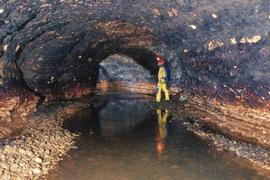 C'est dans ce contexte que Michel Pauwels qui profitait d'une séance topo de la partie inondée reliant la Beva au Rupt, a franchi le 17 avril 2004 D'UNE TRAITE cette fois les siphons reliant les deux cavités et qu'il avait attaqué par les deux côtés avant de jonctionner l'été dernier. C'est une longue phrase ça ! Aussi longue que son parcours à la palme d'ailleurs (un peu moins de 4 km A/R...) et que la durée d'immersion (7h00). Michel était assisté pour cette occasion par Jacques Petit qui a effectué un portage de bouteille jusqu'au-delà du petit tronçon exondé avant d'attendre patiemment entre les deux siphons le retour de son compagnon de palanquée. Une entreprise qui a couté aussi 4 gros portages (en deux jours) aux fidèles porteurs du GRPS et du RCAE + cette fois de C7 qui a eu pitié de leur sort ;-) Vu que le parcours du forage (P47) au siphon fait 1800m, faites le compte, ça leur fait des bornes de crapahut dans les jambes. Mais bouteille sur le dos, ceinture de plomb à la ceinture ou à vide, la rivière du Rupt reste un vrai régal. Si le coeur vous en dit, Michel n'a pas fini la topo ! Message publié au retour par Jack sur la mailing list UBS