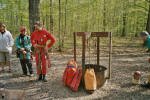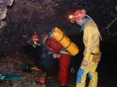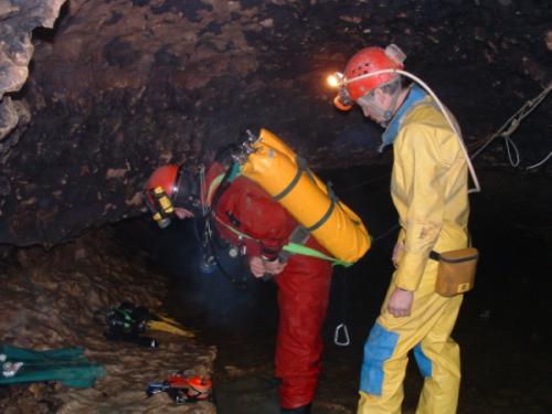 Déroulement Vendredi 16/04/04 : il est 23 heures quand Mosa et Jack (C7) débarquent au refuge **** de Lisle en Rigault, rejoint un peu plus tard par Sabine (Csari)Stéphane (Rcae), pour y retrouver Benoît, Gaëtan,Laurent, Sandy, Ingrid's (Grps), Michel Pauwels (Escm), Françoise et Jacques (Casa) qui sont là depuis la veille et qui ont déjà effectué deux portages au Rupt, une rcce dans le siphon amont et une plongée de rééquipement dans le siphon aval via la résurgence temporaire. Une trop courte nuit plus tard et après un petit déjeuner fait de croissants aux amendes, tous se retrouvent au pied du puits d'entrée pour saluer une salamandre qui sera photographiée sous toutes les rayures. Chacun un kit ou une bouteille au dos, nous acheminons tout au long du parcours principal de la rivière le matériel nécessaire à nos deux plongeurs (en + des deux portages réalisées la veille !). Immersion vers 13h. RV est prit pour 18h30, heure à laquelle ils comptent ressortir... Pas question de glander ici. Nous rebroussons chemin en faisant un petit crochet par l'affluent des marmites. En chemin, nous rencontrons les gars de l'Ess pas trop chaud à l'idée de donner un coup de main pour rapatrier en fin de journée le mato vers la sortie. Retour au refuge pour refaire le plein d'énergie. Le temps d'un spaghetti et d'une projection sur l'ordi portable des photos numériques toutes fraîches et c'est reparti pour le siphon. Philippe reste en surface. Jack accompagne les 4 autres volontaires en espérant faire l'AR sans traîner,question de pouvoir rentrer comme prévu en Belgique à une heure raisonnable. Finalement, c'est après une heure d'attente à scruter le moindre petit mouvement du fil d'ariane sortant siphon, à espérer qu'une bulle éclate à la surface de l'eau, que sont réapparus nos deux spéléonautes. Bonne nouvelle, Michel a pu atteindre la Beva sur ses tiers et faire de la topo du tronçon le plus éloigné. Jacques a su gérer son attente dans cailler. En deux temps trois mouvements, tout est replié et chacun de redescendre la rivière chargé comme un baudet pour éviter coûte que coûte un deuxième portage. Fin des opérations au palan-poulie à 22 heures pour embrayer sur un barbecue sur lequel Jack et Mosa ont fait l'impasse en reprenant la route pour rejoindre leur lit respectif vers 2 heures du mat.