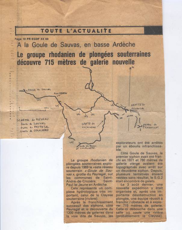 Nous sommes tous repartis en enroulant notre câble téléphonique, retour vers le 1 er siphon. Passage de ce dernier, retrouver notre 1 ère équipe de soutien et direction la sortie de la Goule. Je ne sais même plus depuis combien d'heures nous étions entré dans la Goule de Sauvas. Lorsque l'on en est ressorti, il faisait nuit. Bien 24 heures avaient dû passer. On est partis dormir. Le lendemain, nous déséquipons la Goule, le temps était à l'orage et effectivement, le soir, il se mettait à tonner et à pleuvoir. Plus tard, à Lyon, nous ferons le point, pour prendre les décisions à donner pour la suite de nos travaux dans la Goule de Sauvas.