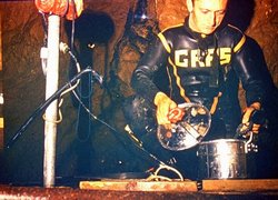 Ici encore, c'était tout fou ! Nous avons déposé nos scaphandres, ceintures de plombs, ventraux de secours, enfin tout notre équipement de plongée. On ne gardait que nos casques, rien d'autre, sauf nos phares de plongées ! Je me saisissais de notre émetteur et envoyais un signal « tout va bien » au dérouleur, puis « siphon franchi », les 5 points lumineux et enfin « demande de liaison téléphonique », nos 10 points lumineux, tout ces signaux répétés 2 fois. Tout en regardant vers le haut et surtout le siphon, je dévissais les couvercles étanches de notre boîtier :