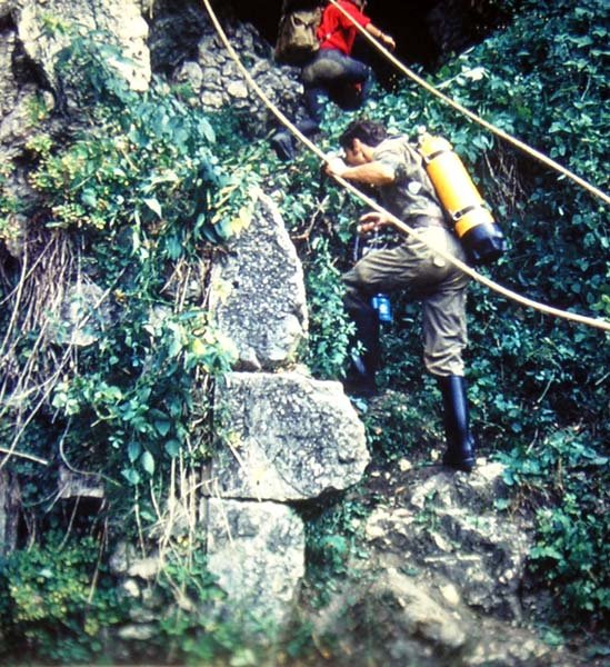 Péniblement, nous sommes arrivés à bout de cette pente très rude et, assis, sur les roches alentours, nous avons regardé autour de nous. En bas, ce n'était pas la joie, on ne distinguait pratiquement plus nos équipements de plongée, tellement l'avalanche de pierre recouvrait nos scaphandres et le reste de notre matériel. Puis nous avons regardé la galerie qui se présentait là, devant nous. Je pense pouvoir dire que personne n'était jamais venu ici avant nous. Nous étions les premiers hommes à pénétrer en ces lieux. J'en suis sûr :