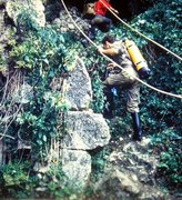 Degré par degré, je parvenais à reculer et à progresser sur ma droite, mais le câble, toujours tendu et tiraillé de part et d'autre, me causait une gêne. De plus, mon ventral de secours, complètement en travers, raclait la roche sous moi, tandis que mon scaphandre butait contre la voûte au dessus. Je ne comprenais absolument rien aux tirades pratiquées sur mon fil d'Ariane et, dans l'instant, je cherchais surtout à me débloquer, pour retrouver Henri. Cet immense « merdier » n'a duré pas moins de 5 minutes, ce qui est très long dans ces conditions !
