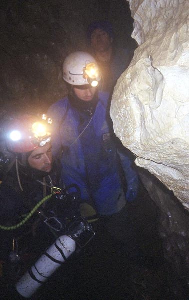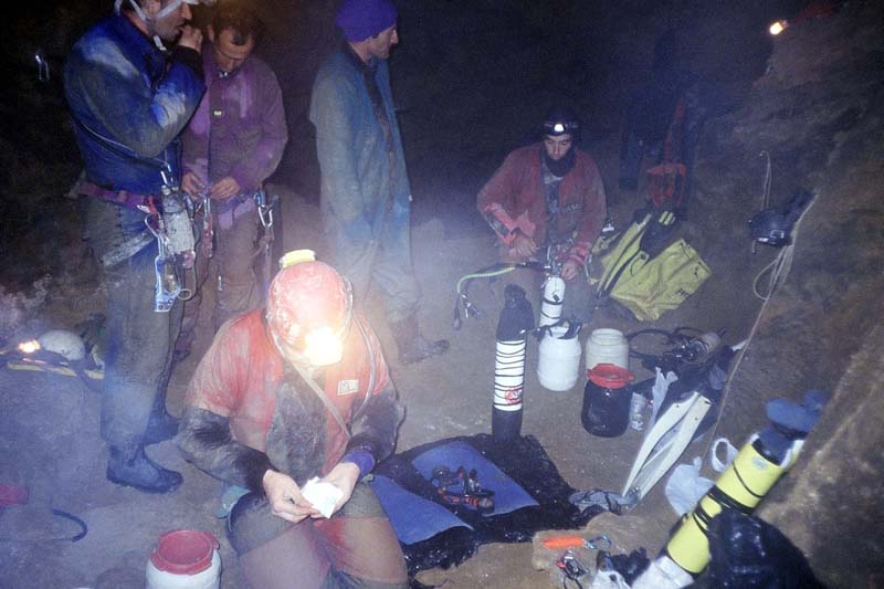 Cette plongée se déroule dans la rivière où arrive le scialet des anciens (à la base des puits, le S1 est à 30 m en amont dans la rivière). Il y a quelques mois, Fredo avait franchi S1 et S2 puis s'était arrêté sur une cascade de 15m à remonter en artif.