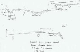 Derrière, une rapide remontée boueuse nous ammène dans une galerie exondée boueuse, légèrement descendante et allant en se rétrécissant. De 2 m de diamètre, nous arrivons au bout de 50m à un laminoir de 2 m de large pour 50cm de haut se terminant par un siphon boueux et impénétrable.