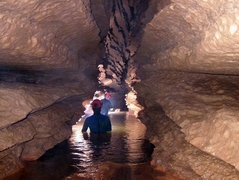 | CALAVEN DE LA SEOUBIO, Herault, France GPS N 43.50.10.9 E 003.50.52.0 DATE: 13-4-2006 DIVER: J Beal SUPPORT: M B Thomas, A Judd The divers rigged the entrance pitch and lowered three sets of diving equipment down the pitch and eight 7l cylinders. JB was then persuaded to dive sump one to inspect the downstream cobble choke. The idea being that whatever size JB dug the hole through the choke the rest of us would fit with ease! The choke was found to be nearly open but with a broken line and our digging bucket firmly wedged in the hole. JB did a little clearance work to get through the choke with ease then returned to base to collect a line reel to repair the broken line. Once done all divers returned to surface. DATE: 14-4-2006 All divers through to the end of sump 5 using 7l cylinders, then MBT kit and a set of 3l cylinders were carried to the terminal downstream sump. MBT then set off into the un-dived terminal sump in reasonable visibility. The sump was passed after 60 meters at a depth of –6.9 meters. After a 30 meter swim in a deep canal ending at a two meter waterfall the diver continued for another 20 meters to a narrow rift taking the full flow of the stream. The diver then returned to base. The sump upstream of Sump 7 was then inspected using a mask and light but was found to be very low and uninspiring, progress could be made with a lot of work beating off roof projections. The team then exited the cave to search for a slim diver. DATE: 16-4-2006 After recruiting KH as the slim diver and CRH as extra underground grunt for the sherpa team several jobs were planned for the day. Two sets of 3l cylinders were to be transported to the end, JB and JSTW were to Radio Locate in the end region of the cave, Also the ongoing rift passage at the bottom of a five meter pitch was to be rigged and explored. Three members of the Greek Caving Club Speleo, were to watch the divers depart Sump one then join Malc Foyle on the surface to learn the art of radio location from a man who had lessons from Brian Prewer two weeks before! Unfortunately a small altercation with the Farmer who was blaming us for damaging a fence and allowing his cows to escape changed the plan a little. After CRH did a stirling job of calming the farmer down and arranging for the dive team to rebuild the fence that was nowhere near where we were, we were allowed one more trip into the cave to remove gear for this trip! As JB and JSTW were the first divers to leave base and so unaware of the ensuing drama with the farmer they continued to the end to make contact with the topside team. For the rest of the divers the sherpa trip to the end quickly turned into a pushing and survey trip. Once minimal kit had arrived at the terminal sump MBT dived through sump 7 with a single 3l cylinder and KH dived through using two 3l cylinders. The divers then surveyed down to MBT previous limit were KH was inserted into the rift and quickly found the way on by climbing high. The divers then continued exploring and surveying for another fifty meters swimming another canal to reach sump 8. This was passed by MBT free diving and was less than a meter long. A further 25 meters of cave was explored to a small pitch needing at least a hand line. The divers then returned to dive base at Sump 7. After JB and JSTW successful radiolocation work JB then dived to survey sump 7 and have a look at the new stuff. While this was going on JSTW and AJ attempted to get down the five-meter pitch into the ongoing passage, but problems with rigging and time forced us to leave this for another trip. All divers returned to the main chamber and a mammoth pitch hauling session took place until well past dark ‘o' clock. A return is planned once the problem with the farmer is smoothed over! Any one wishing to visit the cave please contact MBT regarding the current situation for access. |