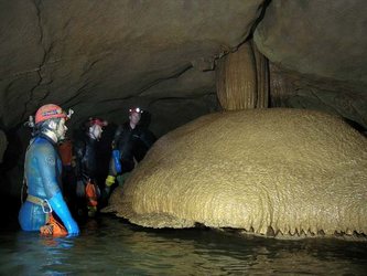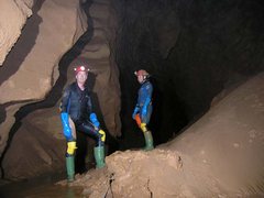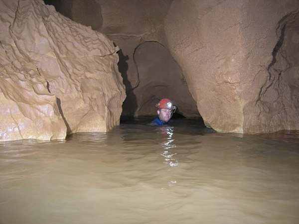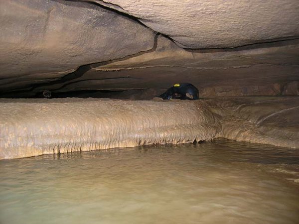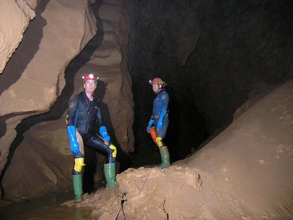 DATE: 1-5-2005 Au cours de notre dernier voyage ici, le 09-08-04 (bulletin 153 du CDG), le plongeur A. Judd a passé le siphon 5 (aval) et a progressé en aval sur approximativement 30 mètres jusqu'à un siphon 6 non exploré. Il a également signalé une possibilité d'escalade sur des blocs vers la gauche avant le siphon. Nous sommes revenus avec l'intention de continuer l'exploration. Nous avons rencontré le plongeur français Frank Vasseur le matin et il nous a donné un bon coup de main ce jour là, ainsi que tout au long de notre exploration. Encore une fois une grande quantité de matériel de plongée et de matériel de désobstruction fut descendue dans la salle principale et rapidement AJ et JB ont pu se lancer dans l'inspection du siphon aval et commencer la désobstruction. Environ 30 minutes plus tard AJ est revenu annoncer que l'étroiture était ouverte et pouvait être franchie. N'en croyant pas un mot MBT s'est immergé avec une bouteille et a directement traversé Seoubio 2 stupéfait. Après que tous les plongeurs aient encore un peu élargi. MBT est revenu chercher FV et pour se diriger en aval vers le siphon 2 afin de réaliser des photos du gisement d'os. Tous les plongeurs, très excités, ont ensuite regagné la surface, ainsi que quelques bouteilles vides. DATE: 2-5-2005 L'objectif était que tous les plongeurs aillent au terminus connu de la cavité et pour JB de plonger le siphon 6 vu par AJ le 09-08-04. Tous les plongeurs ont traversé le siphon 1 avec un équipement minimal et le reste du matériel a été acheminé dans des sacs pour faciliter le franchissement de l'étroiture. MBT et JB sont partis vers le terminus, suivis d'AJ et de LJT un peu plus tard. À l'arrivée au siphon 5 il est apparu que le siphon se passait par une voûte mouillante. Les deux plongeurs ont traversé le S5. C'est là que le doute s'installa ! Les deux plongeurs s'attendaient à voir un siphon au bout de 30m mais après 60m environ dans le grand passage les deux plongeurs n'avaient pas vu de siphon, mais escaladé une petite pente boueuse sur la gauche menant à un grand passage se poursuivant ! JB ,dans le doute, quitta MBT et abandonna ses bouteilles. Environ 250 mètres plus loin, MBT fut convaincu qu'il était dans une galerie vierge. Le plongeur s'était arrêté sur un autre siphon et avait rejoint JB, lequel avait été rejoint entre temps par AJ et LJT. Dès le retour de MBT, AJ essaya d'expliquer à JB comment il avait confondu une laisse d'eau avec un siphon et raté un passage de 6 mètres de large sur 10 mètres de hauteur sur sa gauche ! Tous les plongeurs posèrent alors leur matériel et transportèrent l'équipement de JB à nouveau vers la vasque où MBT s'était arrêté. Tandis que JB se préparait à plonger le nouveau siphon 6, AJ suggéra de vérifier que ce siphon était bien un siphon! LJT nagea rapidement au-dessus du lac, tourna à droite, passa par une ouverture large mais basse (1metre) et poursuivi l'exploration du grand passage. À ce moment là JB était sans bouteille et suivait LJT à travers le lac, puis au-dessus dans une grande fracture. Les plongeurs passèrent devant une belle galerie aval sur la gauche et finalement atteignirent le vrai siphon 6 après encore 200 mètres. Le matériel de JB fut récupéré et amené au siphon. JB plongea le siphon 6 sur 55 mètres à -6 mètres rejoignant la surface dans une petite cloche avec deux petits conduits se poursuivant. Le plongeur supposa que la suite était sous l'eau se réimmergea durant 15 mètres dans un large conduit noyé pour aboutir dans une autre petite cloche prolongée par d'étroits conduits. Le plongeur fit demi tour à ce moment là. Pendant que JB plongeait et LJT aidait le plongeur, AJ et MBT observaient le déversoir signalé plus tôt sur la gauche. Celui-ci s'est avéré être un large passage fossile avec plusieurs embranchements. Les plongeurs ont localisèrent bientôt un passage au-dessus de quelques concrétions et beaux gours et descendirent à nouveau dans une large fracture parcourue par un écoulement. MBT et AJ le suivirent jusqu'à un lac qui semble également remonter vers un autre ruisseau (probablement le ruisseau provenant du siphon 6). Approximativement 500 mètres de grotte ont été explorés depuis la jonction jusqu'au lac amont. La cavité continue manifestement mais les deux plongeurs ont du revenir pour aider JB à ressortir. Tous les plongeurs sont alors sortis de la grotte laissant la majeure partie de leur équipement dans Seoubio 2 et ressortant avec un minimum de matériel. DATE: 4-5-2005 AJ et LJT se sont reposés aujourd'hui et ont refusé de continuer, c'est donc MBT et JB qui sont retournés jeter un coup d'œil à la nouvelle prolongation. Ils ont topographié les siphons 5 à 6 à partir desquels débutent les parties aval explorées la veille. Pratiquement 1000 mètres de cavité ont été explorés, les plongeurs poussant sur environ 400 mètres au delà du lac amont dans une large fracture, mais c'était plus étroit et plus boueux. Un autre diverticule sur la gauche a été exploré et les plongeurs ont fait demi tour dans une grande galerie fossile pleine de concrétions très boueuses mais splendides. La cavité semble devenir impénétrable et les plongeurs n'ont pas vraiment eu envie de poursuivre en rampant. Sur le trajet retour, les plongeurs ont nettoyé le fil par endroit dans tous les siphons alors que la visibilité se détériorait et plusieurs ancrages avaient lâché. Au retour, les bouteilles vides utilisées au cours des deux dernières plongées ont été ressorties pour être regonflées. DATE: 6-5-2005 L'objectif était de continuer l'exploration et de plonger Seoubio 6. JB et MBT ont démarré l'exploration depuis Seoubio 2 d'abord suivi de LJT et d'AJ. MBT et JB ont continué pour explorer la galerie terminale tandis qu'AJ et LJT sont descendu un puits de 4 mètres a proximité de la crevasse menant au terminus. Malheure
