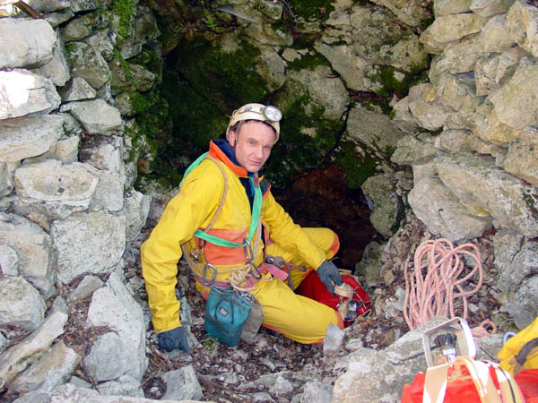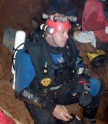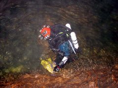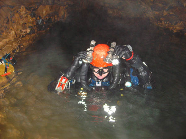 Cette plongée faisait suite à celle, organisée par le SCAL en 1994, qui avait révélé la suite de ce siphon et permis une progression de 285m. Jusqu'à 500m dans une cloche effilée en fracture impénétrable et sans circulation d'eau. A l'époque, avec Michel Enjalbert, nous avions orienté les recherches subaquatiques vers une émersion éventuelle, en vue de retrouver un cours actif. Aussi, avions-nous consciencieusement raclé les plafonds plutôt que le sol du siphon. Avec le temps, l'image des dunes de sable ciselées de ripple-marks, sur le sol de la galerie noyée, incitait à revoir le choses sous un autre angle. Et puis, le potentiel des Monts de Saint-Guilhem, les hiatus sur l'impluvium de la source du Cabrier demeurent considérables. Ca méritait bien de revoir les choses. D'autant plus que l'évolution des techniques et du matériel permet d'aborder ce type de plongée avec plus de sérénité qu'à l'époque. Les vêtements étanches en toile (souples), dotés de purges urinaires (afin de pouvoir rester longtemps immergé et dans la combinaison), les mélanges gazeux (qui atténuent les risques de narcose et diminuent la saturation des tissus) et, luxe suprême, le recycleur (Megalodon version manuelle – Copis) qui diminue la consommation de gaz, minimise la saturation des tissus corporels, rend plus confortable l'immersion (air respiré chaud et humide). Au printemps 2007, quelques contacts préalables avec Jean-Paul confirmaient le soutien du S.C.A.L., qui assurerait l'équipement de la cavité et viendrait en nombre. Avec le renfort de quelques copains et de Jean-Louis, l'inconditionnel de nos aventures cavernicolo-subaquatiques, le projet était remis au goût du jour. La date fut fixée au 26/01/2008. Première difficulté : une barrière à l'entrée du chemin rallongerait la marche d'approche d'un kilomètre. Ce n'est pas rédhibitoire pour une balade dominicale dans le Sergent. Mais pour une sortie plus « lourde », en temps, en matériel et en engagement, autant limiter ce genre de handicap. Jeudi 24, je monte pour un pré-portage des cinq charges les plus lourdes. Ce n'est pas indispensable, mais j'aime ces préliminaires, au moins autant que ces escapades solitaires dans ce somptueux cadre naturel. C'est une de ces journées hivernales à la clarté éblouissante. La couverture émeraude des pinèdes tranche sur l'azur immaculé. Pas d'humidité en altitude, que du bon. La malédiction pluvieuse de cet automne serait-elle conjurée ? La vallée de l'Hérault étincelle d'une couverture de givre en sursis. Le fleuve coule presque clair, la source du Cabrier débite fort, mais cristallin. Bonne surprise, la barrière qui bloque la piste n'est pas fermée, il devient possible de se garer au départ de la combe du Sergent. Le propriétaire du terrain situé à cet endroit, rencontré à la descente, précise que la barrière fut placée par la municipalité pour limiter l'accès, mais pas l'interdire. Nous avons sa bénédiction pour nous garer sur place samedi. Samedi matin, tout baigne, des copains lozériens seront même de la partie. Raymond, à l'enthousiasme et la jovialité communicative, a rameuté large, jusqu'aux piémonts septentrionaux des Grands Causses. Entre désistements de dernière minute et ralliements divers, nous serons assez nombreux pour tout descendre et tout remonter dans la foulée. On se retrouve, on tape un peu la causette. Je retrouve avec plaisir des compères d'escapades caverneuses d'il y a une bonne quinzaine d'années. Jean-Paul et Pierrot, les spécialistes des Monts de Saint-Guilhem, des topos et des désobstructions, Laurent, redescendu de son exil temporaire au pays du Calvados, Samuel, au sourire permanent, Raymond, dynamique et volontaire comme un jeune loup. Les cévenols sont là aussi : Jean-Louis et son appétence karstique inégalée, Patrick et son fiston Samy, novices mais déjà forts de plusieurs portages dans le Gard. J'apprécie aussi de retrouver Jeannot, Fabrice et Alexandre, les lozériens, avec qui plusieurs projets sont actuellement « sur le grill ». Je découvre de nouvelles têtes, la nouvelle garde du SCAL : Thierry, avec qui j'ai échangé par mail, son collègue Jean-Jacques et Sarah, l'unique élément féminin de la troupe. Puis petit à petit, par groupe ou en solo, chacun attaque la montée. La « cheminée », cette nouvelle entrée ouverte après forces escalades et désobstructions en 1993 et 1994 par le S.C.A.L., consiste en une cinquantaine de mètres de puits étroits, progressivement évasés dans la partie inférieure. Etroitesse que j'avais sous-estimée, pensant qu'on pourrait descendre les kits à la corde, depuis l'entrée. Visiblement, l'itinéraire n'est pas une « classique ». Des spits sont rouillés au point de ne plus autoriser le vissage correct des amarrages. Jean-Paul doit d'ailleurs spiter à nouveau un puits. Une fois en bas, la descente des sacs s'avère fastidieuse. Il aurait certainement été préférable de les descendre « à cul » et nous perdons un temps précieux. Finalement, au prix de descentes « musclées », les copains acheminent toutes les charges au bas de la verticale. Les puits sont terminés, on rejoint la « galerie supérieure », au niveau de la salle du sable, 200m avant le « grand lac nord ». Il faudra encore chercher un tantinet pour retrouver les passages conduisant à la vasque tant convoitée. Ce « Grand lac nord » déverse le cours souterrain du Cabrier dans la « grande diaclase ». Elle constitue aussi le premier d'une série de regards sur ce qui est un siphon, franchi via la vasque la plus en amont (4m ; -1) en 1949 par Alex Bournier (SCAL). Nous optons pour une mise à l'eau dans les derniers plans d'eaux, afin de raccourcir au maximum la longueur du siphon, pour ceux qui le franchiront en apnée. Une salle déclive, ponctuée de redans déclives servira de vestiaire. Je monte et assemble les bouteilles de sécurité (une de 9 li