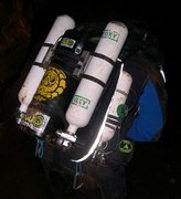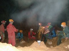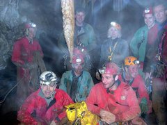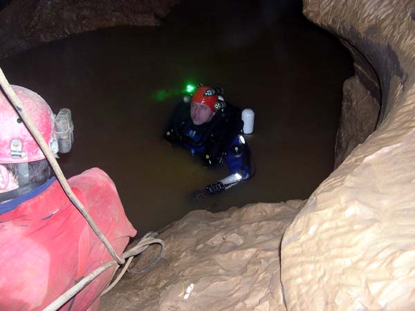 Il y a belle lurette que ce siphon « historique », car plongé par Lucienne Golenvaux dès 1965, était « dans les cartons ». Non pas pour marcher sur les palmes de Lucienne, ce qui, de la part d'un « french lover » aurait été fort inconvenant, mais parcequ'il s'agit du siphon le plus en amont de la cavité. Situé à -100 et environ 500m de l'entrée, ce siphon fut prolongé par la S.C.S.P. (Alès-30) entre 1982 et 1986 (Christian Bagarre, Philippe Nouza, Gil Veyssière) sur 170m (-51). Puis jusqu'à 400m (-30 après un point haut à 21) par Jean-Charles Chouquet en 1988 (topographie), et enfin en 1993 par Marc Douchet qui stoppe dans une galerie étroite et argileuse à la cote 530m. Notre objectif consiste à lever la topographie au-delà du terminus de J.C. Chouquet ainsi qu'à revoir le conduit, des fois qu'une "suite" existe. Nous voilà donc partis le 12 août 2007, pour une ambitieuse aventure. La période, estivale et les congrès associés, n'a pas été pour faciliter la constitution de l'équipe. A l'heure du rendez-vous, les effectifs sont maigres. C'était sans compter avec l'ami Jean-Louis qui motiva moultes équipes en vacances dans le secteur, et finalement, chaque kit trouve épaules à son pied. Avec presque deux heures de retard sur le planning (mais que va donner ma « moyenne » !) nous nous engageons sous terre, entre deux visites guidées. Au terme de la partie aménagée : ressaut équipé en cordes et échelle rigide fixe, petite séance de génuflexion pour découvrir la salle de la méduse et descente sur un chaos. Il suffit de suivre les câbles et les tuyaux raccordés aux pompes destinées à remonter de l'eau jusqu'aux lacs de la partie ouverte au tourisme. C'est d'ailleurs l'eau du siphon Golenvaux qui entretient ainsi, quelques 60m plus haut, les gours contemplés par les néophytes. Là, un puits permet de faire passer le matos sans forcer (à la corde), pendant qu'on progresse à vide par une succession de passages bas sous des concrétions, jusqu'à la base dudit puits. Problème, les amarrages sont en piteux états. Nous bataillons encore une bonne heure pour équiper au moins pire la verticale, en bidouillant entre des plaquettes vissées sur quelques filets et des amarrages naturels sur bouts de sangles glanés çà et là. Ensuite, un lac permanent (on se mouille jusqu'à la ceinture) précède 50m de galerie descendante et légèrement gazée, jusqu'au siphon 28 (dans la nomenclature de la cavité), qui précède de peu le siphon Golenvaux. Le niveau est très bas, mais pas assez pour engloutir les difficultés (escalades, méandre, lac ressaut). En effet, nous comptions sur la vidange de ce premier siphon (d'une vingtaine de mètres) par pompage, pour faciliter et ouvrir à toute l'équipe l'ultime partie du portage, jusqu'au siphon Golenvaux. Là, il est encore plein : je devrais donc haler seul tout le bazar jusqu'au siphon Golenvaux. Deux aller-retour dans le siphon (le S.28). Grimpette un peu raide pour sortir de l'eau avec quelque 80 kg de menue ferraille et de gaz comprimé. Le raidillon suivi d'une méandre moins large me contraint à abandonner une des trois bouteilles. Passage tout en diplomatie en ondulant, autant que faire se peut, de l'excroissance dorsale, puis descente jusqu'au lac. Merci Archimède. Soufflant, suant, je rechausse gaillardement les palmes et repars illico dans l'onde, quêtant avidement l'amorce du puits du siphon Golenvaux. Manque de chance, avec ce niveau bas j'ai perdu un peu le fil (de la description) et le tuyau qui me sert de guide émerge radicalement. Pas de doute, nous n'y sommes toujours pas et il faut consentir une nouvelle escalade, plus ardue que celle pour sortir du premier siphon. J'abandonne les deux bouteilles de sécurité (marre de tout trimbaler pour aller de mauvaise surprise en mauvaise surprise) et rejoins la vasque du siphon Golenvaux. Ca y est, on touche au but ! Enfin, les choses « sérieuses » vont pouvoir commencer. L'eau est limpide. Le faisceau du phare se perd dans les tons azurés, la vasque se fait aguichante, mais . Si le premier siphon était « trop » plein aujourd'hui, le second ne l'est pas assez. Les pompages dans la vasque ont rabattu le niveau de presque deux mètres. Un redan vertical s'interpose. S'il serait possible de rejoindre l'eau en sautant, je n'imagine pas le trajet inverse, à varapper ainsi harnaché. Un coup dans l'eau. Retour dépité avec, la main sur le tas de matériel, promesse de revenir avec les frimas. Unique et maigre consolation : je décroche le record de la plongée la plus courte et la moins profonde en recycleur et avec autant de matériel