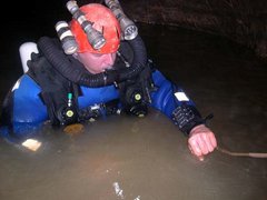 Nous arrivons en 20 minutes au sommet du P.30. En bas, tout va assez vite, malgré que l'endroit, une modeste plage de sable inclinée, manque singulièrement de fonctionnalité et de confort. Mais avec le renfort de 3 paires de mains supplémentaires, nous sommes rapidement à pied d'uvre, dans le S.28. Le niveau a baissé d'environ 40 cm depuis jeudi. Manu confirmera les pompages justifiés pour ajuster les niveaux du fait d'une visite guidée. Je pars avec tout le matériel : le recycleur dorsal, deux bouteilles de trimix 20/30 (9 et 10l) et deux bouteilles de 6l de mélanges suroxygénés (T40 /40 et N80), deux dévidoirs (200 et 450m). Le niveau actuel épargne les déboires crapahutesques de cet été. Je n'ai qu'à palmer, me contorsionner par endroits pour passer sans trop accrocher, fini les problèmes de progression. Le puits d'entrée du siphon Golenvaux est calqué sur une fracture, longue d'environ 5m. La largeur est plus ténue (environ 1,5m), irrégulière. Je dépose la première bouteille de Nitrox 80 à 8, sur la pompe. Le filguide, installé il y a 19 ans, est toujours en place. Il suit l'inclinaison de la fracture, franchement élargie à partir de 15 au bénéfice d'une salle d'environ 4 x 5m. Le fil est rompu, et le brin libre ramené par le courant jusqu'à un amarrage à 20. Je récupère le « mou » et glisse en le déroulant jusqu'au talus de graviers roulés. La seconde bouteille de mélange suroxygéné attendra ici, à -28. La pente glisse sous le plafond en un laminoir de 3m de large, à la voûte étroitement surcreusée sur 50cm de haut. Je raboute un dévidoir afin d'équiper le passage et m'engage pieds en avant dans l'étroiture inclinée. Il fallait s'y attendre, ça coince, le talus glisse par pans entiers et menace de m'engloutir. J'attaque un débourrage en ondulant. D'abord ambiance « Décalecatan, Décalecatan , ohé, ohé » 1 , puis crescendo jusqu'au tempo endiablé d'une superbe Salsa « les reins cambrés au bon endroit » 2 . Il en coûtera 20 minutes de négociation pour franchir ce passage, non sans avoir décroché une bouteille et les deux dévidoirs, pour les faire suivre. Ce contretemps sera sans grande incidence sur la plongée, car le recycleur affranchit de certaines contraintes. En circuit ouvert (avec des bouteilles traditionnelles), l'impact sur la consommation de gaz aurait assurément compromis la suite de la plongée. Je craignais que le labourage des graviers ait troublé l'eau, mais non il semble qu'ils soient lessivés par les crues. La galerie reprend de l'ampleur (2 x 4m) et la visibilité demeure de l'ordre de 3 à 4m. On aurait pu s'attendre à mieux, mais les crues « chasse d'eau », généralisées depuis quelques mois, soulèvent les particules dans les cavités, mais ne génèrent pas de courant assez durable pour les évacuer. De ce fait, nombre de siphons demeurent durablement troublés. Passé l'étroiture, la fracture s'étire en hauteur (environ 5m) pour une largeur de 1,5m. Elle conserve ce module durant les 350 premiers mètres du siphon. Le sol est progressivement composé de blocs. Le fil, équipé à mi-hauteur en rive droite, est régulièrement sectionné. Je prends le temps de « pétasser » convenablement, on ne sait pas de quoi sera fait le retour. Du coup, ce séjour prolongé dans la partie profonde du siphon me coûte au moins 18 minutes de décompression, affichées par l'ordinateur (de décompression) dès la première demi-heure. Il stagnera ensuite, avant de s'activer à nouveau dans la zone terminale, puis durant le retour. J'atteins rapidement le point bas : -51 à 110m du Puits Golenvaux. Le fond de la galerie s'évase, encombré de gros blocs, alors que dans la hauteur, ça pince irrémédiablement. La suite est en plafond, par une cheminée abrupte jusqu'à 46. La fracture retrouve sa morphologie, remonte sensiblement. La section est plus irrégulière, il faut chercher l'endroit le plus large, sur ou sous le fil en place. A 170m, la fracture pince à nouveau. Au sol, deux magnifiques marmites d'érosion. Le prolongement est en rive gauche, par une fissure qui remonte à 35, dans un tronçon ponctuellement plus large (2m) mais moins haut (4m). Je scrute régulièrement les plafonds, les anfractuosités latérales, mais ne débusque aucun conduit qui aurait échappé aux plongeurs précédents. Bon an mal an, j'arrive à 350m, au point haut de -21. Le conduit se dédouble en largeur. Le fil est équipé par le côté nord, le moins étroit. La hauteur s'est réduite à 2m, je progresse « à l'égyptienne », de profil, durant la petite vingtaine de mètres. Le conduit se réunifie alors et reprend ses proportions moyennes. Les voûtes s'élèvent, un redan oblique au nord-est et conduit à 27, au sommet d'une ressaut vertical. A 30,6 (400m), le fil de Jean-Charles Chouquet s'arrête. Deux fils, l'un métré l'autre nu, poursuivent vers l'amont. C'est jusqu'ici qu'il faudra, en revenant du fond, relever la topographie, afin de la compléter. La morphologie change alors radicalement. On évolue à présent dans une galerie plus modeste mais plus large (3 x 3m). Elle plonge à 40 le long d'un talus de galets roulés en rive gauche, mais agglomérés en rive droite. Un passage bas (hauteur = 1,5m) annonce une sensible remontée à 39 pour replonger illico à 45. Dans la descente, le fil nu s'arrête. Un redan vertical ramène à 37 sur des blocs effondrés, alors qu'en plafond la fracture se prolonge. Je poursuis vers l'amont, sur le fil en place, qui descend à 44,5 dans une alcôve colmatée au sol. Un redan presque vertical ramène à 39 à 500m du départ. Ici, le siphon réduit brusquement en section (2 x 1,5m), s'encrasse de dépôts limoneux blanchâtres (inexistants jusqu'alors dans le siphon) et la visibilité descend brutalement à moins d'un mètre. Je remonte jusqu'à 35 dans ce boyau qui pince petit à petit. Persuadé que la suite n'est pas là je fais demi-tour quelques mèt