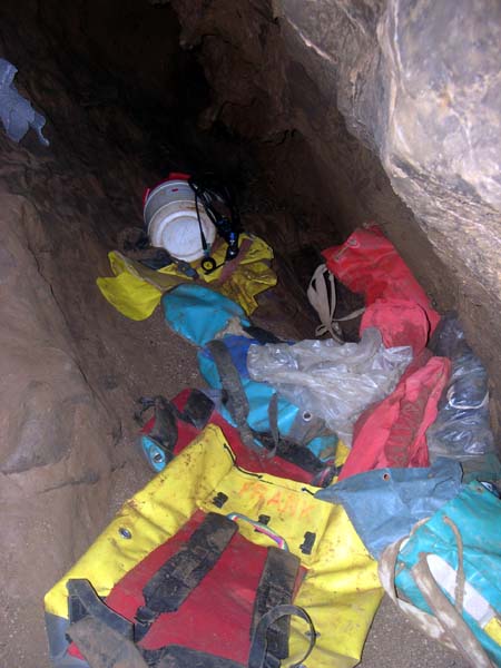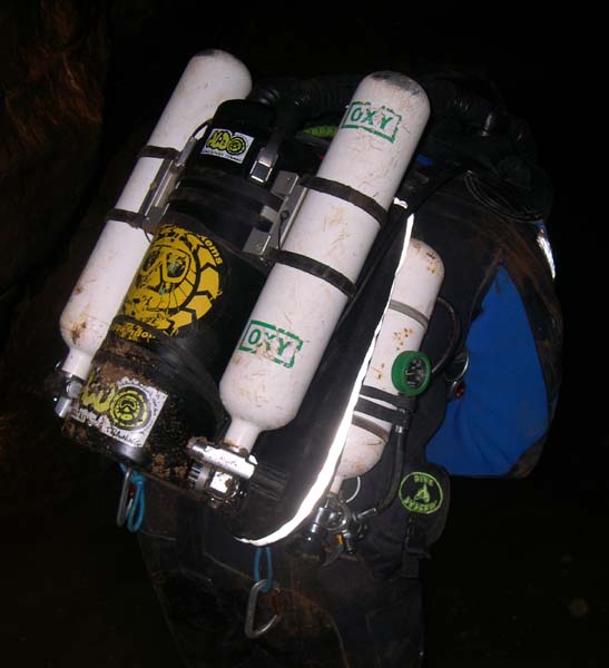 Leçon du jour : mieux vaut plonger avec un niveau d'eau plus haut qui permette de passer du S.1 au S.2 sans trop faire d'acrobaties, comme l'atteste la topographie de Jean-Charles Chouquet, levée en 1988. Pas si simple, car à Trabuc les montées sont très rapides et la vidange lente. En principe la nappe atteint son point bas fin juin jusque vers fin août et s'il n'y a pas d'orages, jusqu'en septembre. Mais cette année, pas de pluies d'équinoxe et le niveau demeure bas. Une crue passe cependant (nos traces de cet été étaient effacées depuis le bas du puits, l'eau est montée jusque-là entre août et décembre) mais il faut attendre la fin de l'automne pour que le niveau se stabilise environ 3m au-dessus de celui de l'été dernier. Petit descriptif du portage : descente par la partie aménagée, puis passage dans la salle de la méduse et descente sur un chaos. Là, un puits permet de faire passer le matos sans forcer (à la corde), pendant qu'on progresse à vide par une succession de passages bas sous des concrétions, jusqu'à la base du puits. Le recycleur monté, il ne manque plus qu'à connecter la tête. Les 4 bouteilles de sécurité étaient prêtes, et déposées de l'autre côté du lac.