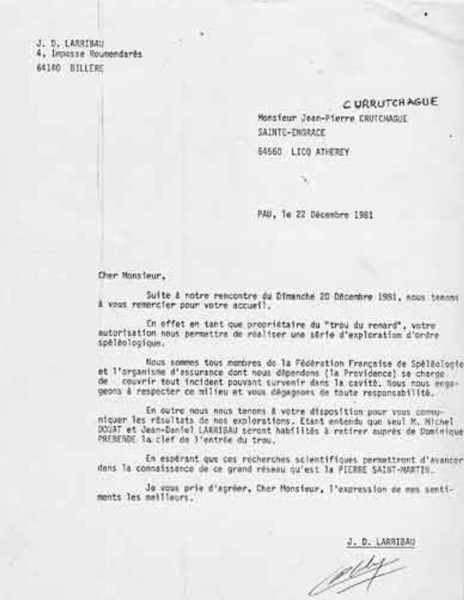 Le 20 décembre 1981 : Jean-Daniel Larribau (membre de l’ARSIP) prend contact avec le propriétaire de l’entrée du gouffre et réussit à renouer de bonnes relations avec J.P. Currutchague. Celui-ci donne l’autorisation de poursuivre les recherches.
