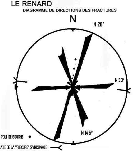 - Les pôles de couches montrent sur 125 m d’épaisseur une légère « flexuration » synclinale d’axe N 93° avec des fractures associées N 80° à110 °. Photo 3 Altitude 555 m.