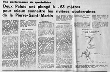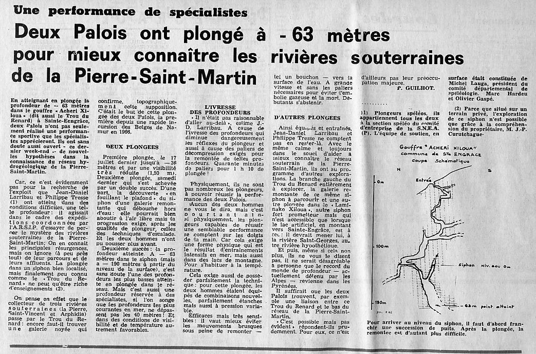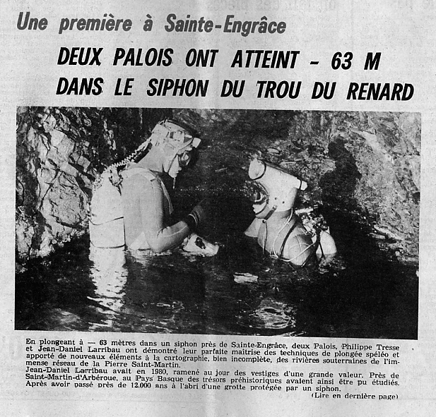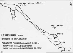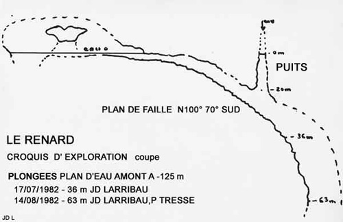 - Le 14/08/82 : Jean-Daniel Larribau et Philippe Tresse (USPA) plongent l’amont à -20 m et 45m de distance. Un puits remontant de 2 à 3m de diamètre est exploré jusqu’à la surface. Arrivée d’eau dans la partie exondée avec vue verticale sur plus de 10m. Poursuite de la plongée dans le plan de faille (nord 110°) en suivant un plancher subvertical jusqu’à –63m. nos lampes ne distinguent pas le fond ni les parois de ce vaste puits.