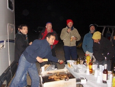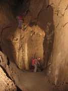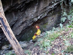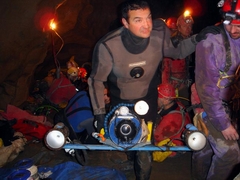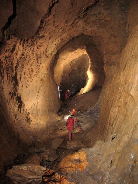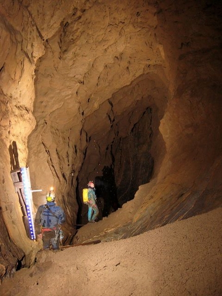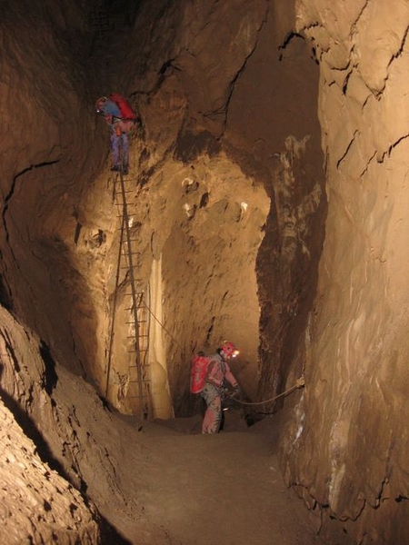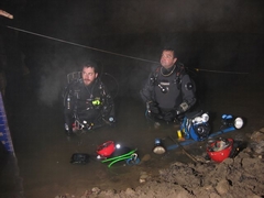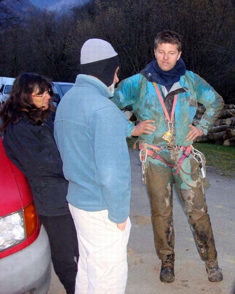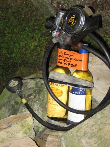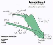 Les projets d'exploration naissent parfois de curieuse façon. Cet épisode au Trou du Renard est né d'une fascination, d'une passion commune pour « la Pierre ». Ce magnétisme trouve son origine auprès de saines lectures. Aux premiers émois cavernicoles, j'éprouvais le besoin de retrouver, dans les livres, l'expression de pareilles stimulations, d'émotions, voire d'addiction pour le monde des cavernes. « Rivière sous la Pierre » de Jean-François Pernette fut le premier à tomber en ces mains néophytes. Je l'ai relu bien des fois, y replonge régulièrement. Rassuré, conscient que d'autres êtres normalement constitués succombaient à l'appel des ténèbres, je compulsais dans la foulée le deux « Jusqu'au fond du gouffre » de Corentin Queffelec, dont le charme suranné n'a d'égal que l'intensité des relations que ces hommes entretinrent avec la caverne. Côté passion, l'existence de l'ARSIP, une structure centralisatrice assurant la sauvegarde et la gestion des informations, achevait de m'émoustiller : un jour j'irai, voir cet « ailleurs » d'un peu plus près. 20 ans sépareront les lectures de l'aventure. Tout commença, comme bien d'autres projets, autour d'un verre. Michel Lauga évoquant les siphons « à revoir », faute de disposer d'informations fiables sur les dernières découvertes. Et de fil en aiguille, d'explorations en rencontres, de discussions en projets, l'affaire prit un tour.. pendable, une fin de camp dans une source béarnaise profonde. Les opérations « lourdes », la mobilisation d'équipes nombreuses n'existent qu'autour de projets d'envergure. Certes. Mais jamais la sauce ne prend sans un catalyseur, un fédérateur d'énergies et de volontés. Tâche ingrate s'il en est, mais fondamentale. On doit à Frédo Verlaguet d'avoir soutenu le projet et impliqué son club (le G.S.Oloronnais), le C.D.S. 64 et sa dynamique commission « Plongée », ainsi que l'ARSIP. M. J.Pierre Accoceberry, le propriétaire de la cavité nous gratifia de son soutien. Qu'il trouve en ces lignes l'expression de notre gratitude. La masse de matériel et le nombre de spéléologues à faire transiter par la cavité imposait une sécurisation des équipements en fixe. Trois sorties furent nécessaires pour vérifier les amarrages en place, installer de nouveaux points d'ancrage, assurer des mats de perroquets et réaliser les premières prises de vues. Le 27-01-08 : équipement, portage du matériel et prises de vues vidéo (Charles Piault, Antoine Cabotiau, Frédo Verlaguet). Le 02-02-08 : Finition de l'équipement, portage, prises de vues vidéo (Jef Godart, Rémi et Daniel Kircher, Pierre Garat, Vincent Cazares, Elodie Lagorce, Henri Laborde, Antoine Cabotiau, Yannick Dolinski). le 16-02-08 : Portage et vidéo (Antoine Cabotiau, Charles Piault, Yannick Dolonski, Eric Garcia et Cécile en surface). De mon côté, toutes les charges pondéreuses sont conditionnées dans des sacs de portage renforcés, leurs longes sont contre-assurées. Certains ont été confectionnés pour l'occasion par Edith et Bernard Trouvé (Société Résurgence), afin de garantir la sécurité de tous les participants. Dans cette descente composée de puits successifs, une charge en chute libre serait ravageuse pour les coéquipiers situés aux étages inférieurs. J'ai prévu une plongée au Trimix, avec un recycleur en version électronique (Megalodon version APECS 2.01 http://www.customrebreathers.com), planifié des tables jusqu'à –130m pour parer à toute éventualité. C'est qu'il est question d'un arrêt sur rien, à –78, dans un puits géant. Je ne disposais pas encore de la vision de Mickey Douat, basée sur la connaissance des particularités géologiques locales. Le 17 au matin, c'est le grand jour. Frédo a bien motivé « les troupes ». Le 17-02-08, 4ème sortie : Portage matos et plongée (remontée ensuite du matos). Première équipe : Vincent Cazares, Charles Piault, Claude Watiaux, Antoine Cabotiau, Eric Garcia, Nicolas Chalk encadré par PM Abadie, Eric Kammenthaler, Brice Maestracci , Vincent Augé, Isabelle Lacrouts, Olivier Lacroix, Laurence Boisloret, Bruno Nurisso et Frank Vasseur. L'équipe a été rejointe par JD Larribau et Patrice Baqué. TPST 9 h 30. Deuxième équipe : Henri Laborde (avec le Champagne), Henri Lalanne (le doyen 63 ans), Nicole Chassagne, Pierre Garat, Régis Lejeune et Jean-Paul Guardia. TPST 4h. Les premiers arrivent avant l'aurore, Antoine était même là la veille au soir ! Nous nous retrouvons au café de Saint-Engrâce, trop exigu pour l'équipe au complet. J'ai plaisir à retrouver d'anciennes connaissances : Vincent, partenaire d'un stage technique de descente de canyon, Brice, celui de mon premier stage de plongée souterraine. A 9 heures du matin, en février, dans le fond de la vallée, ça caille sévère. Les sous-vêtements polaires, cagoules, combinaisons sont prestement enfilés. Histoire de se réchauffer, nous empilons les charges, dont la masse, le nombre et le volume augurent bien de l'huile de genoux. Personne ne traîne à l'extérieur, nous filons rapidement vers l'entrée du gouffre. Tout est prévu, il y a même un kit d'Oenologeothérapie prêt à l'emploi à l'entrée… étant donné son contenu, on serait presque tenté d'y recourir ! Le premier contact ne paie pas de mine, petites désescalades intimes, un petit laminoir et…. du noir : une enfilade de jolis petits puits, avantageusement éclairés par la guirlande de casques qui évolue en cadence, par sauts verticaux, vers le fond. Je m'attendais à une cavité tectonique, des puits intimes, effilés, sombres, austères, tapissés d'argile. Rien de tout cela. La surprise est de taille. Passé les puits d'entrée et le départ vers le réseau Saint-Vincent (l'amont de la cavité qui bute sur d'autres siphons), les puits s'évasent. La section dépasse 5 à 6 m, un ruisselet, issu de la surface, percole et clapote sur les parois, de magnifiques cascades pétri