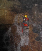 Au-dessus de la cascade, une voûte mouillante, tout juste amorcée en cette période de hautes eaux, débouche dans une jolie galerie richement concrétionnée. Les parois se resserrent progressivement, et lorsque l'abondant concrétionnement s'y cumule, on est contraint, à deux reprises à s'élever de quelques mètres vers les voûtes. Unique possibilité pour trouver un passage pénétrable pour un cavernicole tout de néoprène vêtu et d'acier bardé.