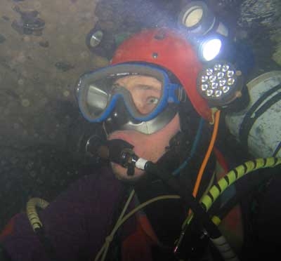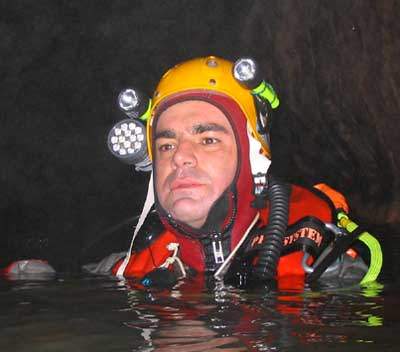 Un dernier salut aux copains, et j'entame la partie solitaire de l'exploration, chargé de deux bouteilles de 7 litres harnachées latéralement et de deux relais -12l de nitrox.