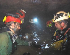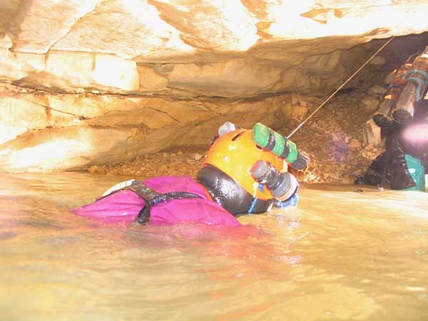 Passé le S.4, Mehdi, Damien et Jean-Pierre se déséquipent. Ici, la cavité se divise en deux branches, parcourues de ruisseaux souterrains qui confluent dans la vasque de sortie du S.4. Vers le nord-ouest, 240m de galeries accidentées nous attendent. Il faut d'abord remonter un étroit méandre, puis escalader 4m pour rejoindre le vaste conduit fossile sus-jacent.