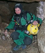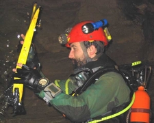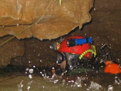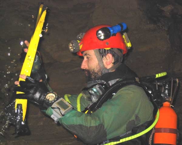 Enfin, le départ du siphon. J'entame là les relevés topographiques pour couvrir cette partie de la cavité, encore inédite.