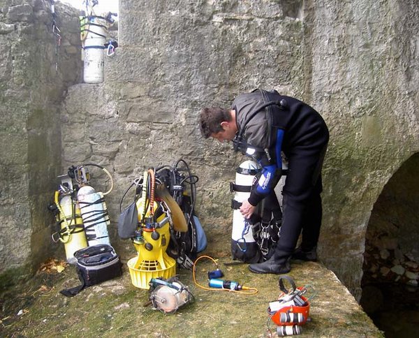 puis remonte. Dans le même temps, nous invitons quelques collègues belges, en goguette d'autres siphons gardois, à rejoindre les vidourlophiles. Plusieurs plongées sont consacrées à la zone terminale de la Fontaine, sans résultats probants, malgré une fouille minutieuse. 2004 n'est pas une bonne année, même si des avancées significatives sont réalisées dans plusieurs autres cavités du système. Un camp d'une semaine est prévu fin août avec une dizaine de plongeurs. Nous plongerons à partir de la Fontaine et du Grand aven en même temps. Le « chaînon » manquant se résume théoriquement à une centaine de mètres. La jonction, on y croit. Nous nous rabattons vers d'autres cavités en amont, mais la forte concentration de gaz carbonique rend l'atmosphère irrespirable. Quelques points d'interrogation sont néanmoins levés dans les 300 premiers mètres de la Fontaine, dans un « brouillard » caractéristique de cette résurgence. L'étiage d'hiver de 2005 est favorable. Dans le vide intérieur du secteur terminal de la Fontaine, un fil rompu indique, à contrario, l'origine de l'écoulement. La suite est là. 100m de fil sont déroulés d'une traite, arrêt dans une vaste galerie, en rive droite. Encore une belle réalisation de nos collègues d'Outre Quièvrain. En avril, alors que le dicton proscrit la petite tenue, la fontaine s'éclaircit. Aussitôt dit