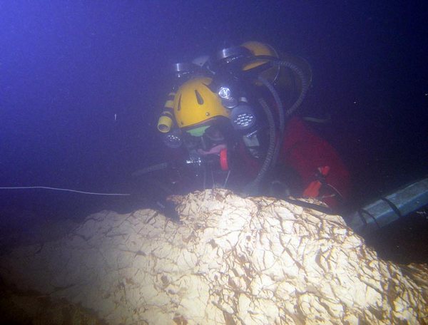 La roubine qui délimite les départements du Gard et de l'Hérault, à proximité du littoral, semble bien anodine, une fois l'estive venue. Pourtant, chaque « épisode cévenol » (phénomène de précipitations abondante) génère des « vidourlades » (crues violentes) tant dévastatrices que médiatisées. Quelques dizaines de kilomètres en amont, un ruisseau cévenol, parmi d'autres, sourd des massifs schisteux. A la manière la Vis, ce rù esquive le soleil, dès lors que son cours croise les calcaires. Le fleuve Vidourle, gonflé de confluences souterraines, regagne la surface sous les remparts médiévaux de la ville de Sauve, huit kilomètres plus aval. Les multiples regards sur ce parcours hypogée, le relief ruiniforme, les cours d'eaux asséchés, mais aussi les épidémies de choléra, eurent tôt fait d'attirer les karstophiles. Dès la fin du 19 ème , Edouard-Alfred Martel conclut une première campagne sur une note on ne peut plus enthousiaste : « Il y là un Padirac inachevé ! ». La Fontaine de Sauve, résurgence du Vidourle souterrain, est une source assurément capricieuse. La moindre averse sur les Cévennes la fait réagir. La visibilité est médiocre, une diète pluviale d'une quinzaine de jours s'impose pour ambitionner un champ de vision équivalent à 2m. Plusieurs groupes montpelliérains tentèrent quelques plongées dès 1968. Le GEPS de Marseille, alors à la pointe des évolutions techniques, réalise une avancée décisive jusqu'à la trémie (200m de l'entrée) en 1972. La galerie est vaste, surmontée de nombreuses cloches d'air, labyrinthique, chaotique, le courant pousse. En 1978, les provençaux poursuivent dans la Fontaine, prolongée entre-temps par une autre équipe jusqu'à 240m. Après avoir franchi une étroiture à 240m, ils progressent jusqu'à une cloche située à 500m de l'entrée, après un point bas à 30m. « Le courant et la turbidité des eaux, ajoutés à la configuration de cette résurgence rendent son exploration délicate. Néanmoins, vu la direction, la configuration et les distances actuellement parcourues de part et d'autres, la jonction avec le réseau aval du Grand Aven nous semble désormais possible ». Le Grand Aven de Sauve, phénomène d'ampleur remarquable, bée 1000m au sud-ouest de la Fontaine. Une falaise d'une trentaine de mètres couronne un cours d'eau temporaire, activé lors des crues. Ambiance néo-Guinéenne garantie. En aval comme en amont, des puits révèlent de vastes bassins. Les difficultés d'approche diffèrent à 1979 les premières plongées, fructueuses des deux côtés, à nouveau grâce au GEPS emmené par Jean-Louis Vernette. Par la suite, le potentiel de ce karst suscite plusieurs plongées, alimentant progressivement la Fontaine en fils d'Ariane qui, contrairement au produit de la treille, ne bonifient pas avec le temps. A partir 1998, une équipe languedocienne, flanquée de quelques provençaux, s'attaque à la fontaine. Bien que de précieux documents aient été produits par le G.E.P.S. sur d'autres cavités du secteur, les informations sur la Fontaine sont plutôt maigres. Peu de détails descriptifs, pas de topographie ni de croquis. Devant l'ampleur de la tâche, nos barboteurs procèdent par ordre. Tous les itinéraires plus ou moins balisés et toutes les cloches sont d'abord topographiés. Les anciens fils sont déséquipés et remplacés par de la cablette décamétrée sur le cheminement principal. Les galeries secondaires, les cloches, les conduits parallèles sont équipés de fil d'Ariane et raccordés au câble. A l'aube du présent millénaire, nous en sommes à tourner en rond à 210m de l'entrée, à nous casser le groin sur une fracture étroite surmontée d'une trémie. L'affaire ne sera pas simple. Le conduit est vaste (certainement plus de 8 x 6m de section), sa morphologie est complexe (dédoublements du conduit, section irrégulière), le courant augmente au fur et à mesure de la progression (delta de sortie étalé sur 300m) et une zone étroite limite tant le volume que le nombre des bouteilles utilisables. En 2000, changement de stratégie. Les plongées sont organisées en hautes eaux. Après de vaines immersions et une étude approfondie de la topographie, une série d'étroitures révèle enfin un ancien fil, une galerie plus humaine. L'anguille, souvent présente dans ce secteur, nous l'indiquait en s'y repliant. Mais la joie est de courte durée. Après la zone étroite, nous tournons quelques mois encore dans le « grand laminoir », en bouclant de façon récurrente sur le fil principal, jusqu'à la cote 270m. Le « team » se remet à fouiner et, en remontant au travers de la trémie, une puissante cloche est retrouvée. Elle sera baptisée « la cathédrale marseillaise » en hommage au binôme de Jean-Louis Vernette qui l'avait attendu là, à 230m de la vasque, pendant sa dernière pointe. Il avait eu le temps de l'apprécier sous tous les angles et, tempérament phocéen à l'appui, l'évaluait apte à loger la « Bonne Mère ». A nouveau, l'étude de la topographie oriente de façon décisive les investigations, et c'est via les voutes que la voie s'ouvre. Le fil du GEPS retrouvé ouvre la voie d'un puissant collecteur. Sa section, grossièrement circulaire, dépasse 5m. Les ripple-marks, au sol, orientent sans équivoque les évolutions. Dans la foulée, nous atteignons la cloche dans laquelle avaient buté les explorations, à 500m de l'entrée. La poursuite des explorations est à présent modérée par deux zones d'étroitures. Les limites d'autonomie des 2 x 9l + relais sont atteintes. Marche arrière à nouveau. Retour à la case « fouinage ». Les moindres recoins de la source sont passés au peigne fin et en 2001, c'est gagné. Un jour de meilleure visibilité, une lucarne confortable nous ramène de l'autre côté de la trémie des 210m. La seconde étroiture, à 270m, est aussi évitée. La grosses bouteilles, le propulseur entrent en