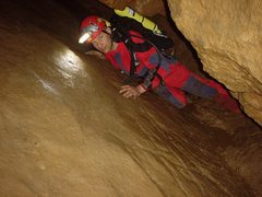 Vient ensuite « l'enfer de Verdun », une galerie d'environ 100m de long où il faut patauger dans une boue épaisse et collante avant d'atteindre la vasque du 1 er siphon. Nous sommes alors à 140 mètres de l'entrée. |