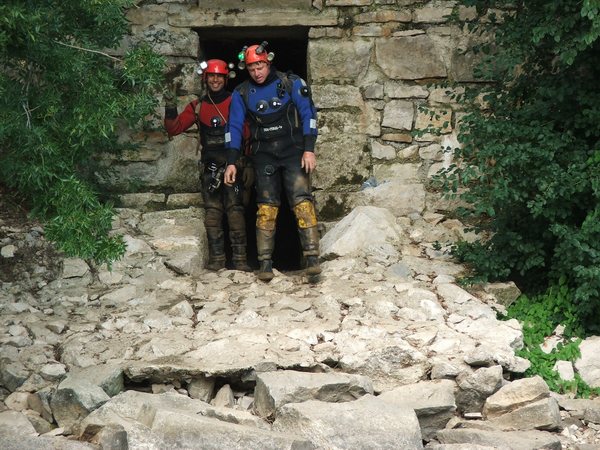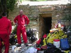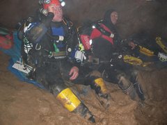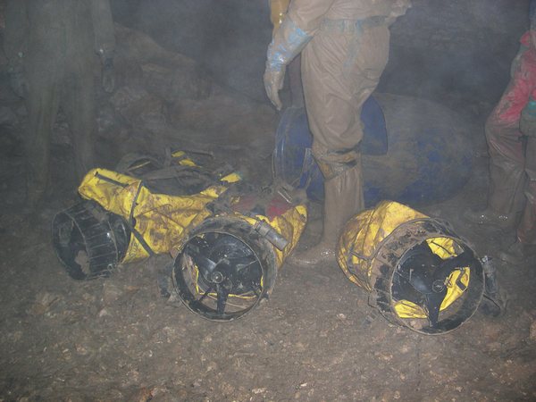 L'accès de la cavité n'est pas facile, surtout lorsqu'il faut transporter du matériel lourd et fragile comme les recycleurs et les propulseurs. Pendant toute la journée du samedi, les spéléos du CD81 FFS transporteront des centaines de kilo d'équipement jusqu'à l'entrée du siphon n°1, tandis que Dominique, Samuel, Eric et Cedrik franchiront le siphon pour acheminer les propulseurs et les blocs de secours jusqu'à l'entrée du deuxième siphon. Dimanche, Claude et Nadir plongeront dans le 2 ième siphon pour déposer 3 bouteilles de sécurité à 300, 600 et 900m de distance.