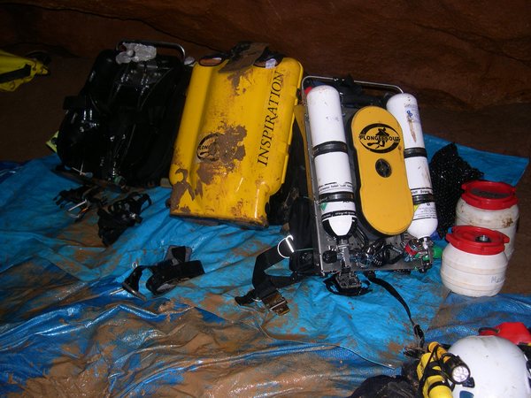 C'est sans doute la première exploration française d'envergure mettant en jeu 7 recycleurs et 6 propulseurs pendant une semaine. Si les Suisses et Allemand ont choisi de ressortir leurs recycleurs chaque soir, les français ont choisi de les laisser au fond de la galerie. L'avantage est immense ; seules les bouteilles de 3 litres seront remontées et rechargées tous les jours ainsi que les cartouches de chaux sodée. Le gonflage sera réduit à sa plus simple expression.