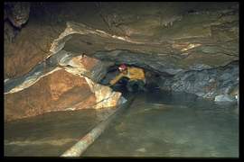 | ETE 1983 Un tunnel routier qui court-circuite la zone d’entrée est aménagé. Lors des travaux, un gisement paléontologique est mis à jour dans la galerie, ancien exutoire fossile de la cavité. (Rhincéros ...) Nos explorations se poursuivent et le S4 est franchi avec beaucoup de difficulté. Ce sont 4280 m qui sont découvert au total. Un traçage à la fluorescéine sera réalisé dans les pertes de OHIRON. 1992 -