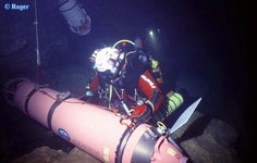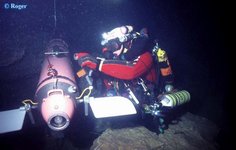Etant doté d'un seul circuit fermé, je choisis de mettre dans le siphon trois bouteilles de décompression de 15l que je laisse à l'entrée, trois bouteilles de 20l chargées avec des mélanges respirables de 0 à -60. J'en conserverai deux avec moi plus une en compagnie d'un maialino *( scooter ) de 2km d'autonomie. Je les abandonnerai vers 1600-1700m de l'entrée.