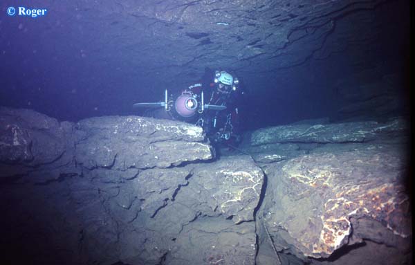 Je range les équipements et avant de breler le recycleur, je vérifie les capteurs d'oxygène. Tout est en ordre. Je m’immerge et d'un bref coup de palmes, je rejoins le maialino et me voilà arrivé au fil que j'ai déroulé il y a quelque semaine en revenant des Siori. Je le suis et rejoins le point où je me rappelle avoir vu une grosse fenêtre. Comme l'autre fois je surprends une concentration de Prothée. Je descends de mon propulseur, suis le fil et entame le palmage. Après une dizaine de mètres je vois de nouveau le fil de Rick et cela signifie qu'ils sont encore dans la galerie des Veci.