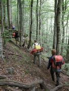 Il pleuvra violemment pendant 36h ce qui est exceptionnel pour la saison et qui aura, vous l'avez deviné, une conséquence grave et unique: tout se met en crue. Nous ne pourrons plus pénétrer dans Matka Vrelo durant la seconde semaine d'expé. Exit donc la seconde pointe profonde, oubliée la galerie exondée aperçue au plafond de la "Salle Peoni", fini les espoirs de continuations dans le haut de la "Twilight Zone". Nous consacrons le temps qui nous reste à prospecter de nouveaux objectifs, à aller reconnaître le bassin d'alimentation de la source de Matka et à visiter quelques classiques sous la conduite efficace de nos hôtes macédoniens. Nous parcourons ainsi la vallée de la Patiska Reka dont les eaux disparaissent lentement sous terre dans les environs du village de Patiska. Les traces de mise en charge de la récente crue sont bien visibles, mais le volume d'eau supposé nous semble de loin inférieur à celui qui jaillit violemment de Matka Vrelo depuis 2 jours déjà. Il est clair qu'il faut chercher d'autres sources d'alimentation à notre source! Sans doute une partie de la solution est-elle enfouie sous l'énorme vallée sèche dans laquelle sont sis les villages de Breznica et Jabolci. Des pertes existent d'ailleurs en lisière de la forêt à cet endroit. Tout ceci devrait être préciser par une étude géologique et des traçages qui restent à réaliser.