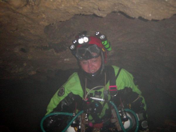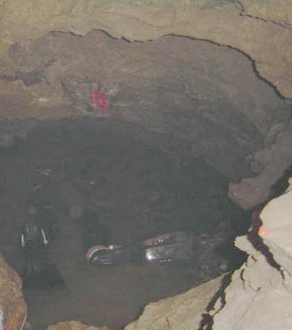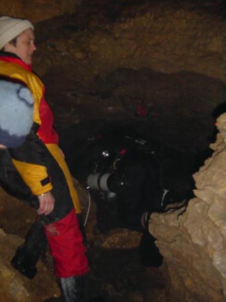 "…… Maxime jette encore un dernier coup d'oeil à mon équipement et me donne le "go" pour le début l'exploration. Je prends l'azimut et m'immerge; déjà après quelques mètres j'émerge dans une salle d'environ 8 mètres de long. Le tamponnoir qu'il a laissé lors des plongées d'équipement du S1 est toujours bien visible dans la paroi de droite au-dessus de l'eau. Devant moi se présente un monticule de glaise dont je dois escalader le versant abrupt afin de poursuivre l'exploration. Le sommet de ce monticule se trouve en ce moment sous l'eau, dont dont le niveau est 10 à 20 centimètres plus bas que lors de ma première visite de février . Je me hisse en m'aidant de la corde de 11mm fort opportunément installée à cette fin par Maxime lors de sa dernière plongée puis je m'avance avec des mouvements de reptation sur le sommet du monticule, le franchis et m'immerge immédiatement à nouveau. J'aperçois dans le faisceau de mes lampes à l'autre extrémité du lac la galerie qui continue droit devant moi. L'eau contrairement à mes attentes craintes est d'une clarté cristalline ce qui nourrit mes espérances me laisse espérer de pouvoir enfin trouver la suite.