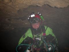 C'est dans un conduit aux dimensions confortables d'environ 3 mètres de largeur pour 1,5 mètres de hauteur que j'avance maintenant, il s'incurve à une profondeur de 4 mètres et suit une pente marquée. Je m'aventure dans une galerie au sol jonché de-ci de-là de plaques de gravier mais recouvert la plupart du temps recouvert par une boue fine. Chemin faisant je dépose un premier plomb et y fixe le fil puis continue ma progression; après vingt nouveaux mètres la galerie plonge abruptement jusqu'à 10,5 mètres tout en faisant une nouvelle courbe prononcée, c'est là que je dépose le second plomb et y fixe à nouveau le fil. S'ensuit une remontée relativement rapide qui me laisse espérer de percer le siphon et d'émerger ainsi dans la suite de la galerie sèche après 55 mètres de progression en plongée. Mais la nature, architecte aux desseins imprévisibles, en a décidé autrement; le couloir ici d'une modeste profondeur de 2,5 mètres fait un coude à gauche ensuite un puits me mène à - 6,5 mètres, c'est là que je dépose mon 3 ème plomb et y ancre à nouveau la ligne de vie, s'ensuit un nouveau coude à gauche et le conduit continue en conservant sa forme de tunnel aux parois lisses et au plafond galbé . Quelques mètres encore et la nouvelle section de la galerie dans laquelle je progresse devient de dimensions plus intimes : un pincement dont la hauteur n'excède pas 0,5 mètres pour une largeur de 1,5 mètres.