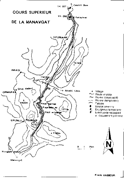 Le caractère particulier du bassin d'alimentation de la Manavgat réside en l'absence de circulations aériennes affluentes. Le cours d'eau est alimenté par de puissantes émergences pérennes certainement en rapport avec les grands poljés situés à l'altitude moyenne des 1000m. Toutefois certains exutoires secondaires ou de moindre importance semblent fonctionner en perte durant les étiages, expliquant les fluctuations de débit selon les secteurs, et ce malgré les débits conséquents et permanents des exsurgences principales.