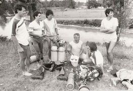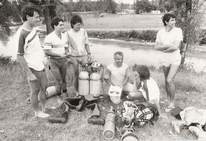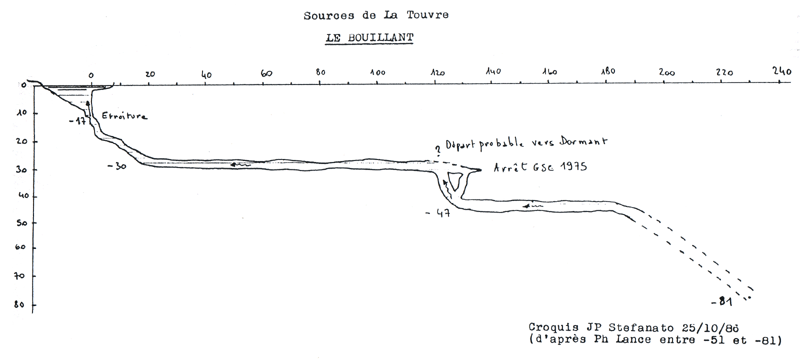 Avec la moitié de plomb que pour la dernière tentative faite par Stéfanato, nous partons pour forcer le passage du Bouillant. Bi 12l pour chacun. Je laboure le cône, qui mène à –15, avec la gueuse que je dois soulever en prenant appui sur le fond malgré ma bouée en surpression. Ca souffle fort, mais la fonte s'enfonce et il n'y a qu'à fixer la corde qui fouette les alentours. Au-dessus du triangle de la fameuse entrée, elle vibre bien. Je laisse le phare pour ma poignée placée côté descente. J'avale le mou le plus possible de derrière mon rocher, et , dès la traction, le courant me met sur les rails. Instinctivement, je retiens ma respiration, mais je cède rapidement à un halètement consciencieux. Arrivé dans la petite salle que forme la galerie (3 x 3m), je largue ma ceinture pour l'objectif que l'on a à présent : moi, le premier puits, Vincent le deuxième. Court intermède à –40 dans le puits où je me sens emporter vers le Dormant. C'est en fait le même qu'a découvert Vincent, dans lequel le courant fait une spirale. Arrivé au-dessous de l'étroiture, je parque cette fois ma ceinture de palier uniquement. Je descends donc en vérifiant poche et inflateur à tour de rôle, dans ce gigantesque tube dont j'ai déjà perdu la moitié du contour. Mais il n'est plus là, la chambre à air sur mon bras droit non plus. Je n'ai pas pensé à prendre les deux anneaux de chambre qui assuraient mes instruments pour ficeler le bobineau. Tant pis ! 19 min 34 s. Ca va, je n'ai pas dépassé les 20 minutes. J'enroule quelques mètres de fil pour poser le bobineau sur un méplat. Vincent part pour ses paliers avec l'oxygène en me laissant « l'U.S. book ». Je le rejoins avec la 12 litres « antibulle « et lui montre le croquis très simple, mais très beau pour moi.