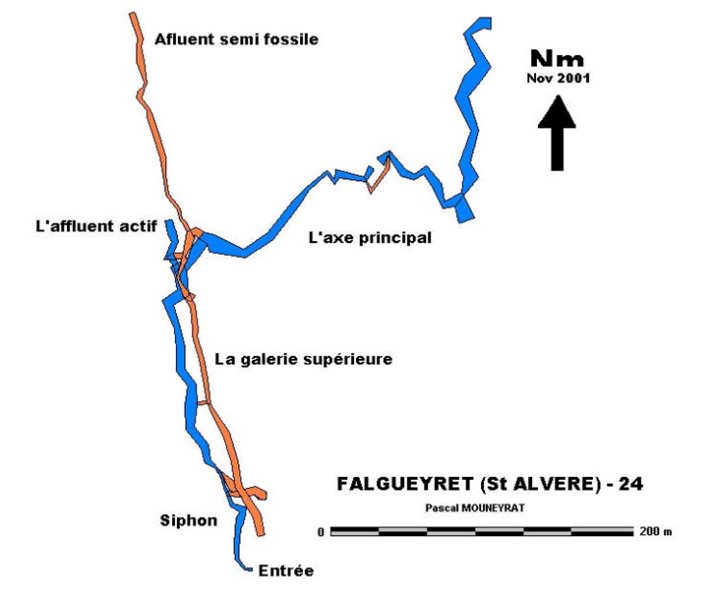 Description L’axe principal du réseau actif dont l’orientation n’est pas encore bien figée avec une préférence au Nord-Est magnétique (entre 25° et 45°). Le creusement suit l’orientation de la faille pour moitié de son développement puis change radicalement de morphologie pour prendre une tendance de creusement en joint de strate. Ce qui explique l’incertitude pour l’instant de l’orientation du cours principal car plusieurs facteurs peuvent en déterminer ses axes (le pourcentage du pendage et son orientation générale, la nature du calcaire traversé, la vitesse de la circulation souterraine, la dissolution …etc.). La galerie est dénuée d’argile et le cheminement se fait sur un lit de gravier et de sable. Le volume des galeries s’accroît en progressant et devient carrément spacieux à certain moment avec des galeries de « métro » de 10 m de largeur par 6 mètres de hauteur La doline du Cros de la Bille est nettement visible dans la cavité sous la forme d’une grosse trémie d’effondrement (un point d’absorption de proximité à moins de 300 mètres de la source.) La morphologie de la galerie montre pour l’instant qu’elle est plus sensible aux zones d’absorptions de type dolines ou pertes qui se voient bien sur les cartes selon un axe du lieu dit « Lavalade » à St Avit Vialard en direction de la source. Notre sentiment est qu’il faut s‘attacher à poursuivre le cours principal de ce système qui peut encore nous révéler bien des surprises, notamment notre attention se portera aussi, sur d’autres affluents que nous allons très certainement découvrir et ainsi analyser leurs directions pour préciser les risques. Pour l’instant on évalue les ressources en eaux fournies par l’axe principal à 60%. L’affluent actif draine quand à lui 40% des ressources en eaux de consommation. Il n’est pas pénétrable car trop étroit, c’est la partie inférieure de l’affluent semi fossile creusé dans une grande diaclase. Le creusement est orienté suivent un axe de diaclase constant favorisé par une grande « faille » ou « diaclase » visible sur la carte géologique. Pour ce qui nous intéresse nous pensons que le terme de « diaclase » est le plus approprié car nous produisons la définition suivante publié par P.FENELON chercheur au CNRS en 1967 : Diaclase « cassure sans déplacement relatif des strates, perpendiculaire ou oblique au plan de stratification dans les roches calcaires; les eaux d’infiltration y circulent avec rapidité, elles usent et dissolvent et élargissent les parois formant les diaclases. Les diaclases sont donc des fissures ou discontinuité. Les fissures ainsi ouvertes sont de toutes dimensions de plusieurs mètres à plusieurs hectomètres voire kilomètres.» Cette morphologie de creusement est très sensible du fait de la rapidité ou les eaux de surface pénètrent le système, par les diaclases ou fissures. La zone du lieu dit « Falgueyret » en direction du château d’eau, vers « Les Brandes », est à surveiller. Cet affluent actif doit facilement se charger d’argile lors des crues et troubler un peu la source. L’affluent semi fossile est donc la partie supérieure de L’affluent actif, il est pénétrable, très argileux et humide avec plusieurs arrivées d’eau en plafond. Il se termine sur une trémie argileuse probablement un effondrement de la galerie en diaclase liée à la surface. La galerie supérieure est l’ancien cours de l’affluent qui revient vers l’entrée et se termine à proximité du siphon. Le creusement en forme de diaclase est la suite logique de l’affluent semi fossile. Des racines d’arbres, nous permet de penser que l’on ne doit pas être bien loin de la surface. Remarque "Le site est protégé, car capté pour les communes environnante."