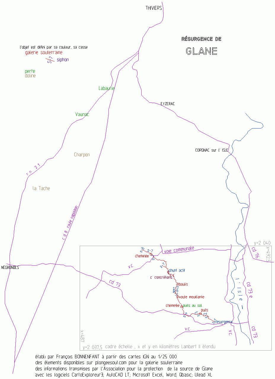 En 1977, F.Le Guen et H.Lefevbre franchissent le S1 et s'arrêtent au S2. En 1983, C.Locatelli et M.Douchet plongent le S2 = 400m (-30) puis le S3 = 30m (-10) arrêtés sur grande galerie à l'air libre. En 1984, F.le Guen et H.Lefevbre dépassent le terminus et plongent le S4 = 70m (-2) découvrent 500m de vastes galeries et butent sur un S5 à 1575m de l'entrée. Un collectif de plongeurs reprend les explos de 1988 à 1989 : JL.Sirieix, JP.Stefanato, B.Gauche, D.Sable,... et leurs explos s'achèvent sur des voûtes mouillantes qui parfois se transforment en siphon, mais le terminus touché à 4350m est entrecoupé de passages en laminoirs étroits. S1= 80m (-3) ; S2 = 400m (-30); S3 = 30m (-10); S4 = 70m (-2); S5 = 25m ; S6 = 95m ; S7 = 15m(-2), en tout 730m de siphons pour 4350m de développement total de réseau.