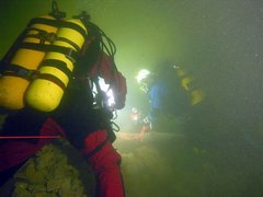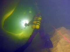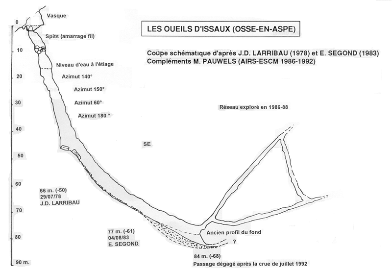 En 1987, Michel Pauwels (B) passe un point bas à -62 suivi d'une galerie ascendante (45°) en interstrate jusqu'à -45. Arrêt sur visibilité nulle.