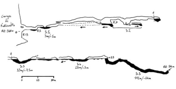 Une remontée de 24m livre l'accès à une galerie confortable (3m de diamètre) parcourue par la rivière. Au sommet d'une cascade (5m), le S.1 (3m ;-1) est suivi d'une galerie moins large. Le S.2 se shunte par une galerie supérieure via plusieurs escalades. On remonte ensuite la rivière (cascade de 6m) jusqu'au S.3 (33m ;-7,5) qui se prolonge sur une dizaine de mètres car la partie exondée est trop étroite. Une trentaine de mètres de progression dans un conduit aquatique conduit au S.4 (29m ;-3), passé lequel une galerie basse, affectée de profondes marmites d'érosion, rejoint le S.5 (110m ;-24). Il débute par un puits de 7m et se développe dans une galerie spacieuse (2 x 2m) jusqu'au terminus, une étroiture sévère sensiblement ascendante.