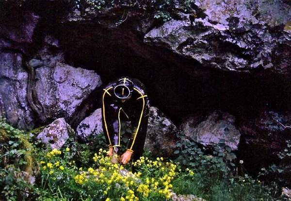 Vers l'amont, une galerie confortable (3 x 4m) se développe dans un joli calcaire gris clair, cupulé et granuleux. L'orientation des coups de gouges est cohérent avec le sens actuel de l'écoulement. Au bout de 23m, à –4, le conduit débuche sur un splendide volume noyé (puits « Do not fly ») aux dimensions exceptionnelles (7m de large environ pour plus de 10m de long). En plafond, un puits débouchant a été découvert en 1982.