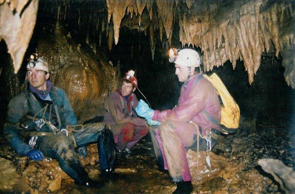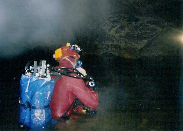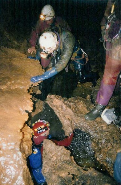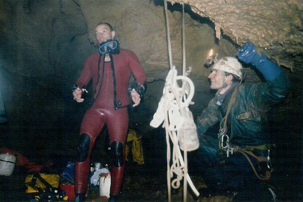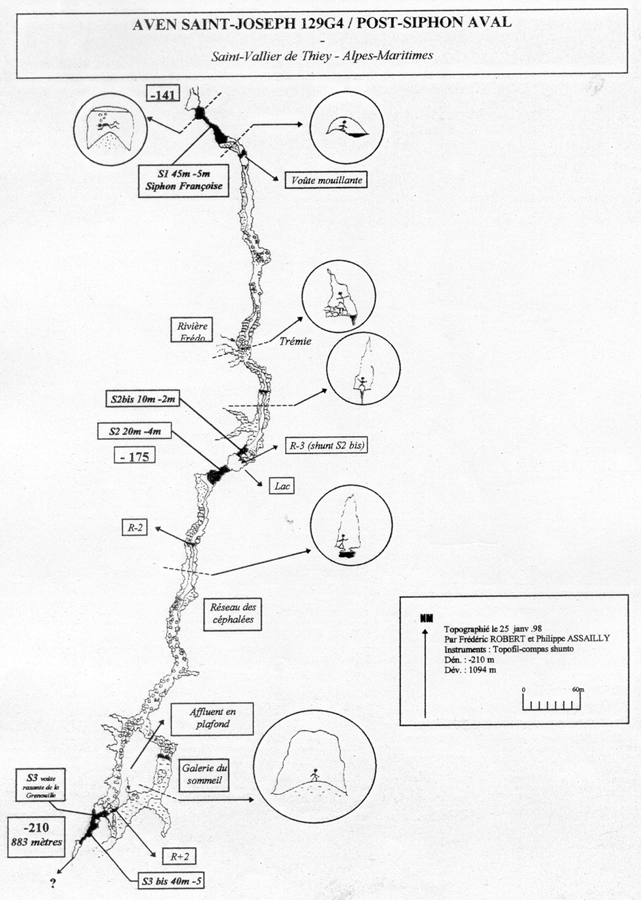 Son inventeur, Christian MELLOT, a percé une partie de son mystère en découvrant -entre autre- un actif majeur : la rivière 4 étoiles. Sa progression fut cependant rapidement interrompue sur siphon. Frédéric POGGIA viendra à sa rescousse et franchira les obstacles subaquatiques au cours de quatre plongées réparties sur les années 93,94 et 95. Ses croquis d'exploration fourniront de précieuses informations et de nouveaux espoirs. L'histoire du Saint-Joseph est aujourd'hui rédigée dans une monographie de C.MELLOT. En 1997, Frédéric ROBERT (Spéléo-club de Cannes-Le Cannet) décide de reprendre le travail de Fredo POGGIA dans la partie post-siphon aval de la rivière 4 étoiles. En effet, la topographie complète du réseau reste à faire et surtout la jonction avec L'air chaud, autre réseau majeur du plateau, est à réaliser. Les reports de vue en plan et la comparaison des dénivelés permettent d'estimer une proximité des deux actifs de 50 mètres environ... Aussi, au cours de trois plongées dont deux en solo, 1094 mètres de réseaux seront topographies, la galerie du sommeil (fossile) et un S3 bis seront découvert. Lors de la tentative de pointe du 14 mars 1998, un incident technique et des conditions météorologiques défavorables ensuite nous empêchent de faire aboutir mare projet cette année-là. Trois autres plongées seront cependant nécessaires pour récupérer du matériel laissé dans le S1 et en post-siphon. Pour terminer, un grand merci aux 46 spéléos des différends club des Alpes-Maritimes pour leur si ingrate contribution mais sans laquelle rien n'est possible... Plongeurs : F.Robert (Speléo-Club de Cannes)/Ph Assailly (Aven Club du Pays Grassois) Auteur et renseignements complémentaires : Frédéric ROBERT- 04-66-45-31-01
