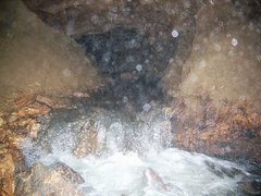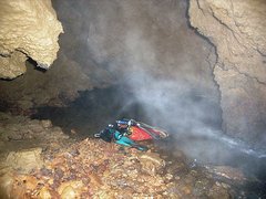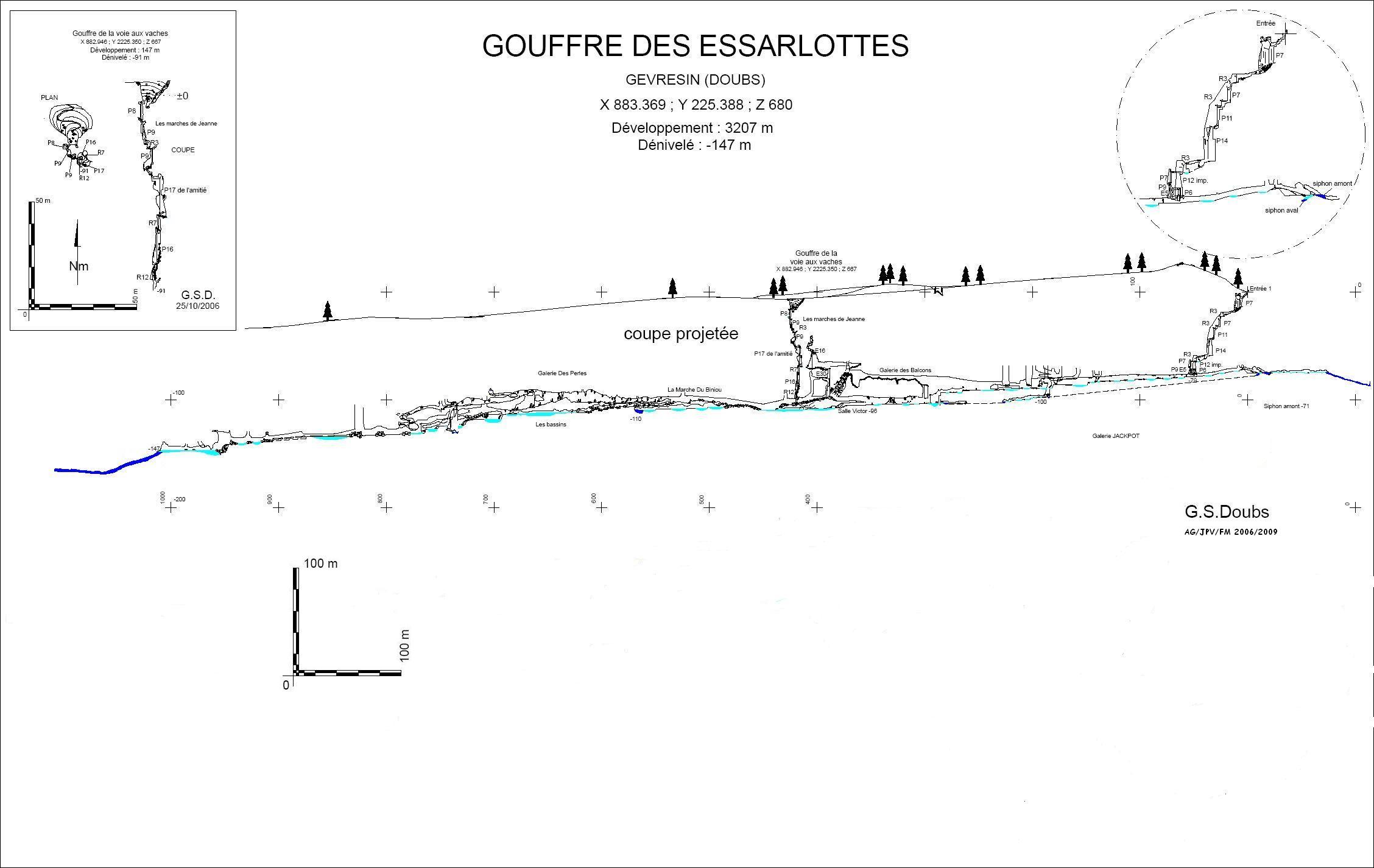 Au-delà de l’ancien terminus un puits de 10 m est entrevu. Quelques micros tirs plus tard le passage est enfin élargi, à sa base la suite est une fois de plus impénétrable et ce n’est qu’après une escalade de 5 m qu’une continuation est découverte… Mais le premier du groupe court déjà dans la galerie du Jackpot ….Cette course s’arrêtera à l’amont sur un siphon à 100m du débouché du réseau dans le collecteur. A l’aval, l’intégralité de la galerie du Jackpot est découverte ainsi que la salle Victor. L’exploration continue ce jour là en franchissant la marche du biniou (qui nécessite de planter quelques spits), le cours actif est à nouveau rejoint et ce n’est que devant des bassins profonds que l’équipe doit faire demi- tour.