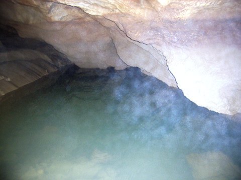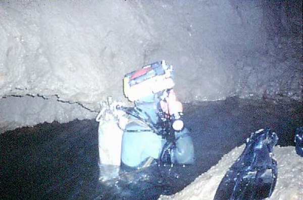 C’est le jour de l’exploration de l’actif au-delà des grands bassins. Cette fois les membres de l’équipe se sont munis de combinaison néoprène. Cette grosse séance permet de mener conjointement : exploration, topographie et photo. Cette sortie va cette fois nous conduire, après l’équipement de grandes vires jusqu’à une voûte mouillante que les moins frileux franchiront pour s’arrêter quelques mètres plus loin sur un siphon aval, la suite se passera donc sous l’eau ……