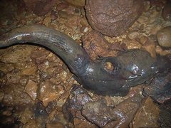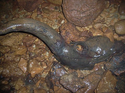 Ce pendant ma seconde plongée, durant laquelle j’ai réalisé la topographie de la partie déjà explorée, m’a permis de voir que cette branche n’était autre qu’une corne. De plus, les niveaux moins importants ont mis en évidence le crâne. Etant munis d’un appareil photos, j’ai ramené quelques clichés qui ont permis d’identifier ces ossements comme Bos Primigedius communément connu sous le vocable d’auroch. |